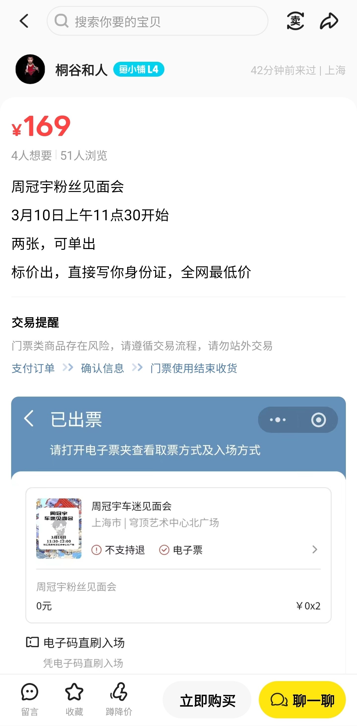 周冠宇粉丝见面会的二级价格只要169元。有时间的朋友可以过去溜达溜达。