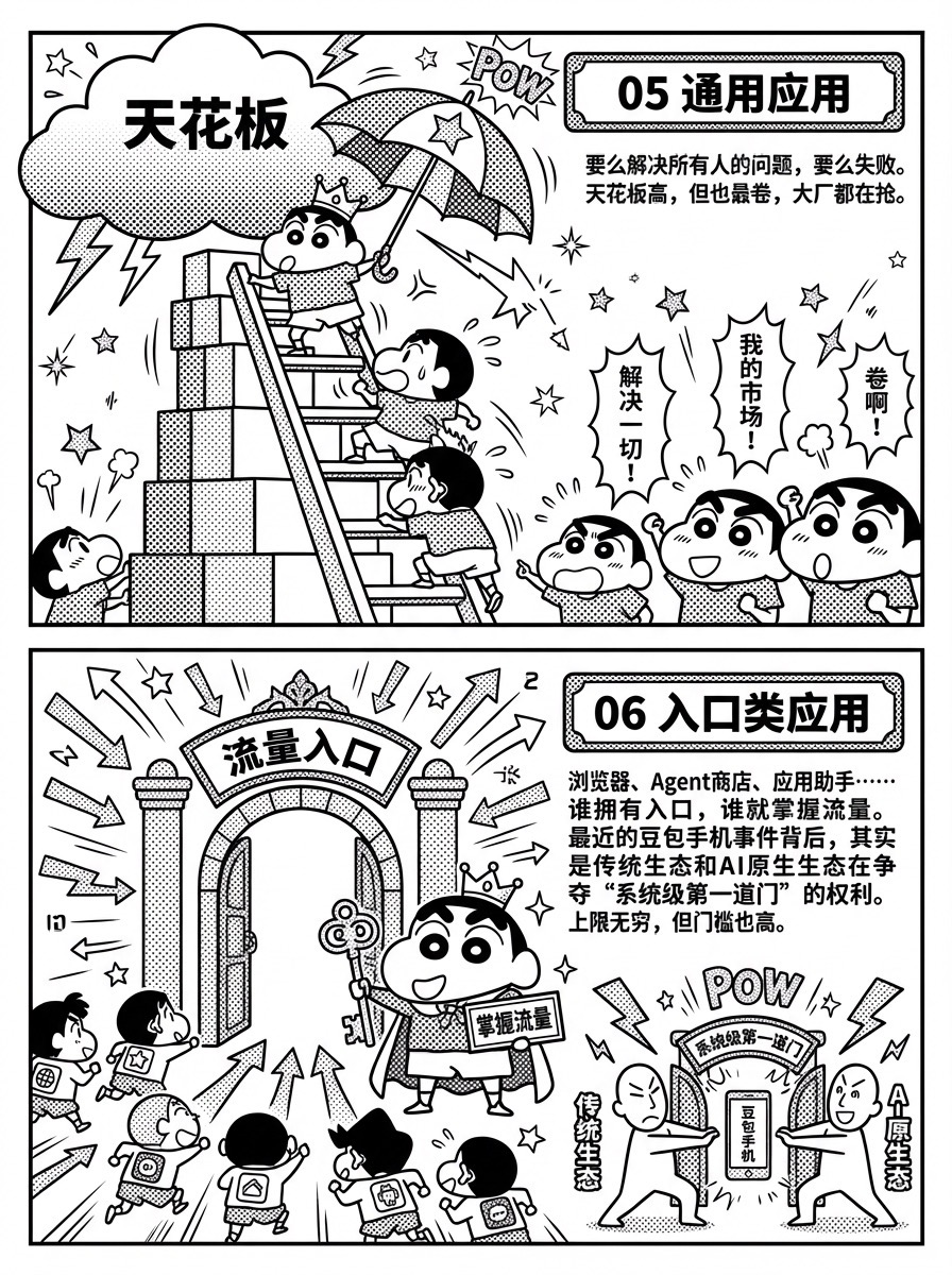 浏览器、Agent商店、应用助手……谁拥有入口,谁就掌握流量。前段时间的豆包手机事件背后,其实是传统生态和AI原生生态在争夺系统级第一道门的权利。去年12月1日发布,短短72小时内就被微信、淘宝、银行集体一起单挑了——入口权有多贵,由此可见。上限无穷,但门槛也高。