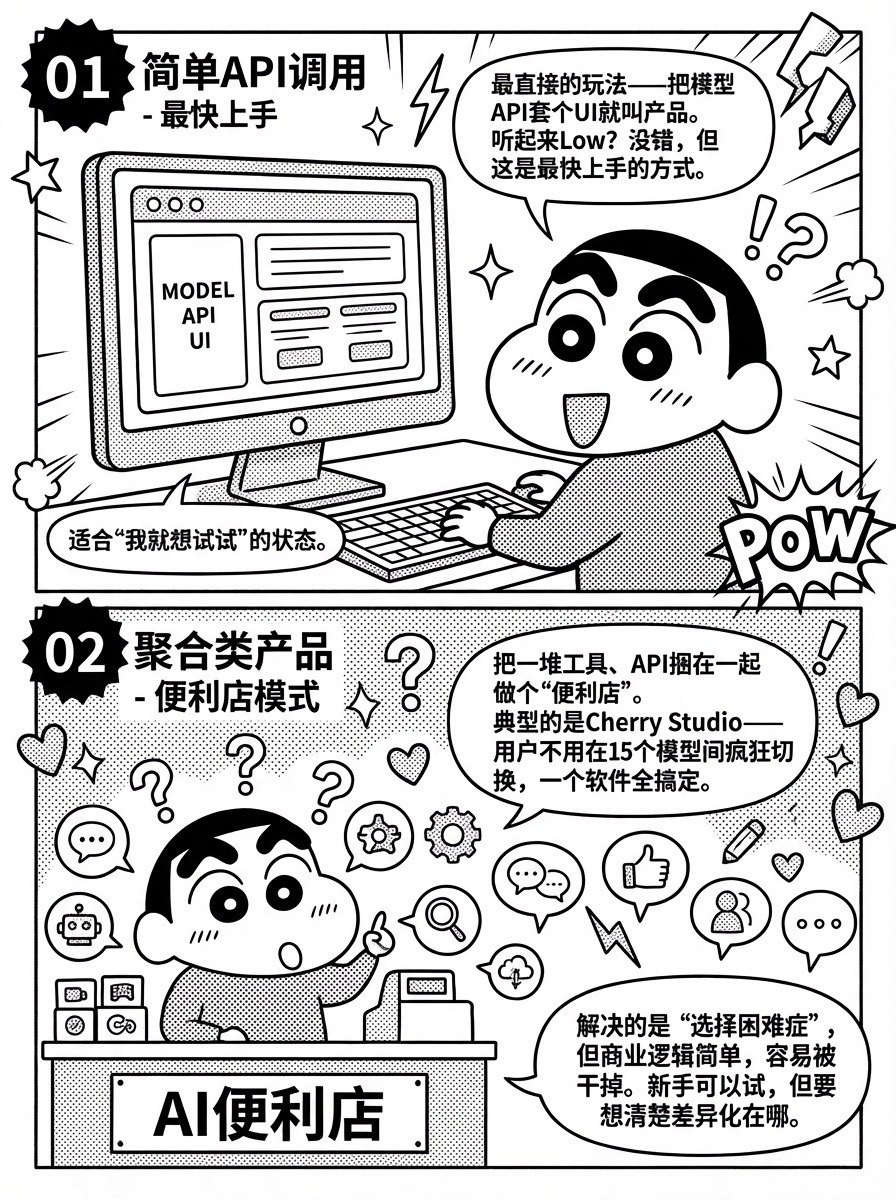 最直接的玩法——把模型API套个UI就叫产品。听起来Low?没错,但这是最快上手的方式。适合"我就想试试"的状态。