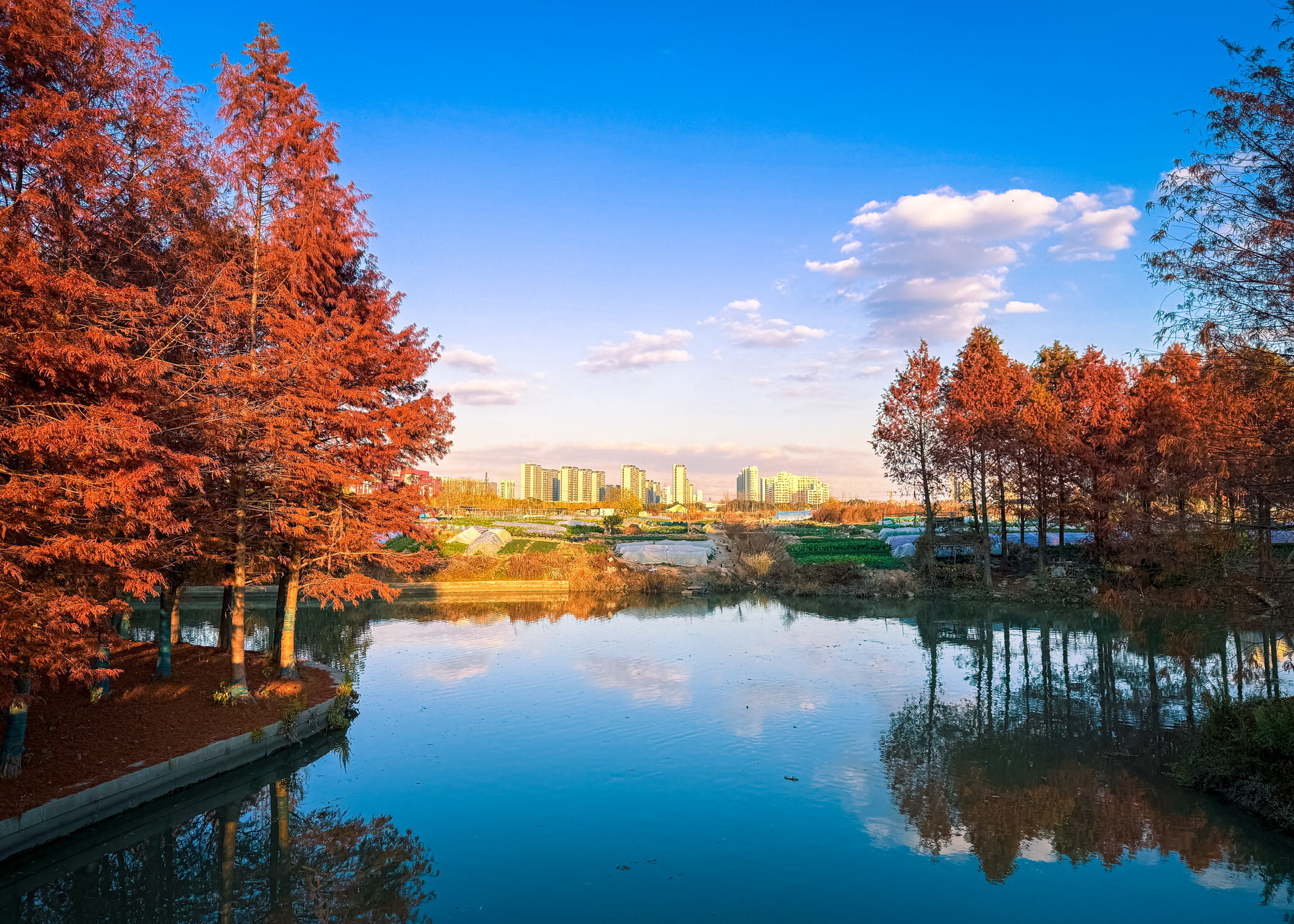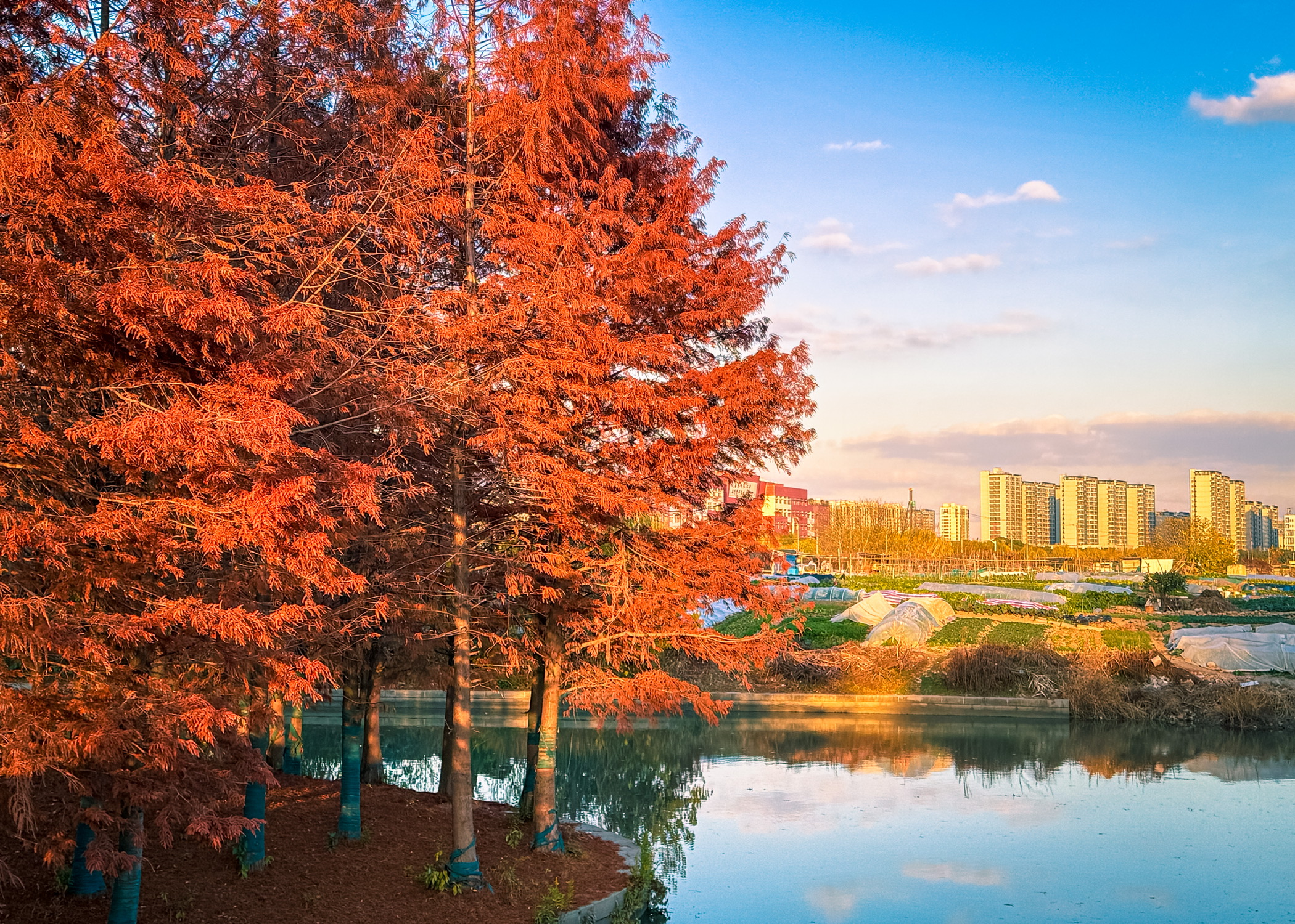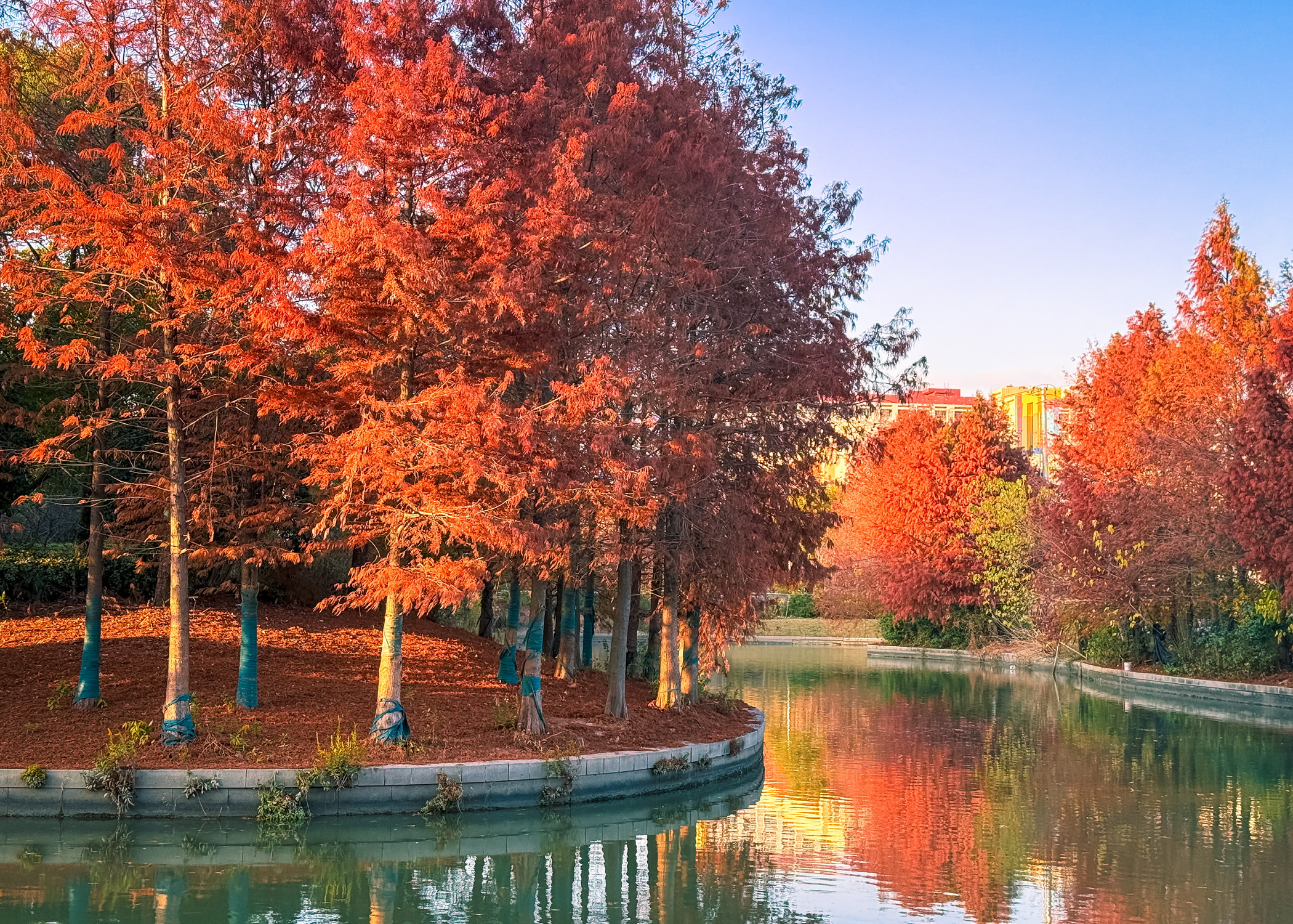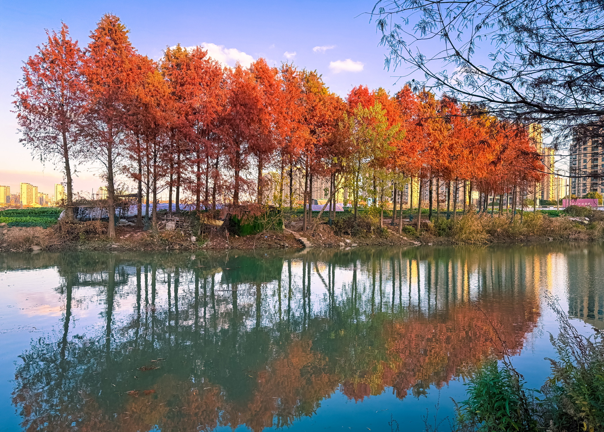 路过虹梅南路与东川路、紫凤路当中一座桥,回头瞥见桥下一片红杉秘境,在日落的照映下显得那么的好看。