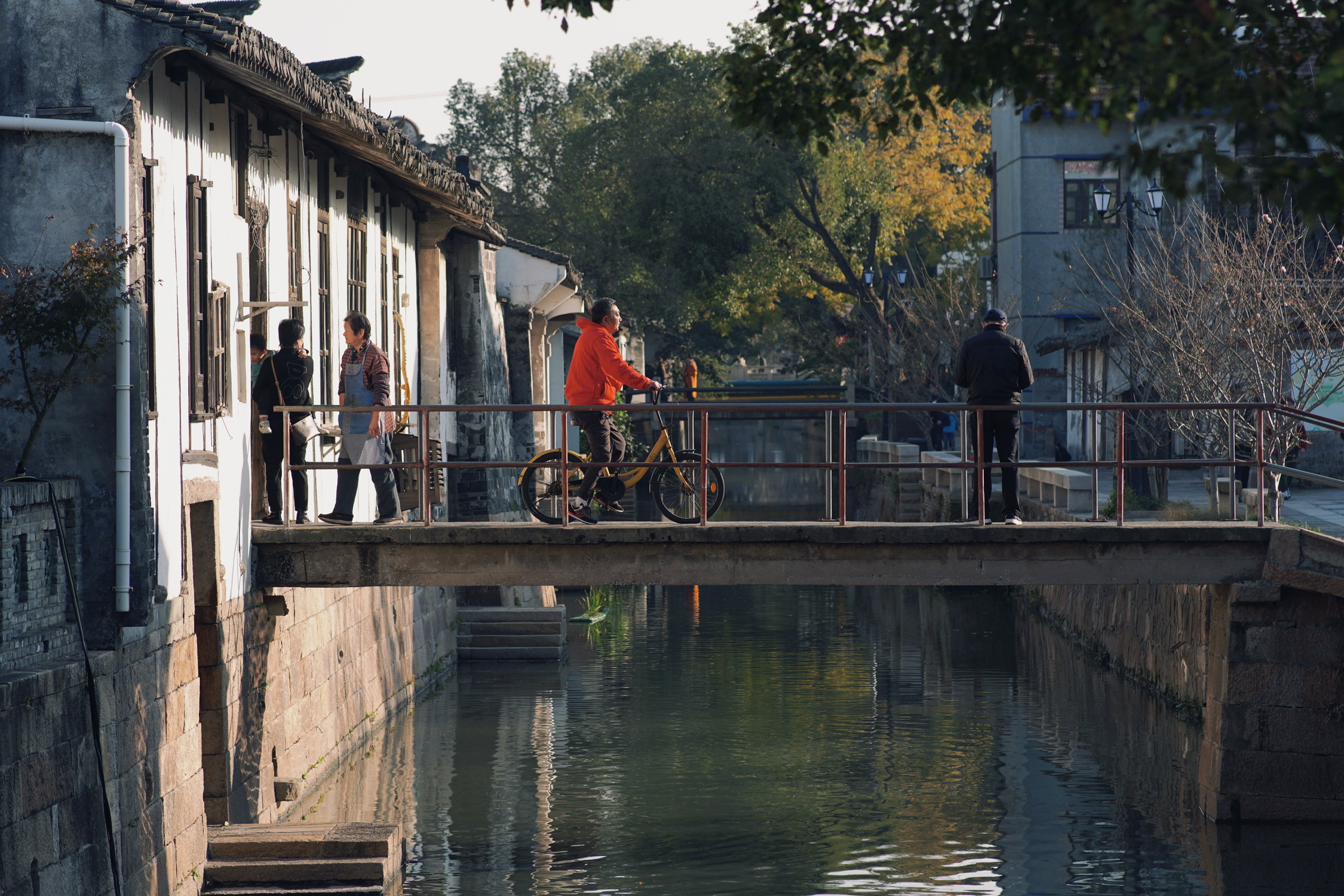 凌波桥畔的乌桕最是贪心,把秋的色谱都揉进了叶尖:新绿还没褪尽,鹅黄已漫上脉络,橙红叠着绛紫,在晴光里晕出三四重渐变,像把深秋的阳光都织进了枝叶里。红枫的艳、三角枫的柔、鸡爪槭的俏,各擎着一团秋色,在风里晃出细碎的光。