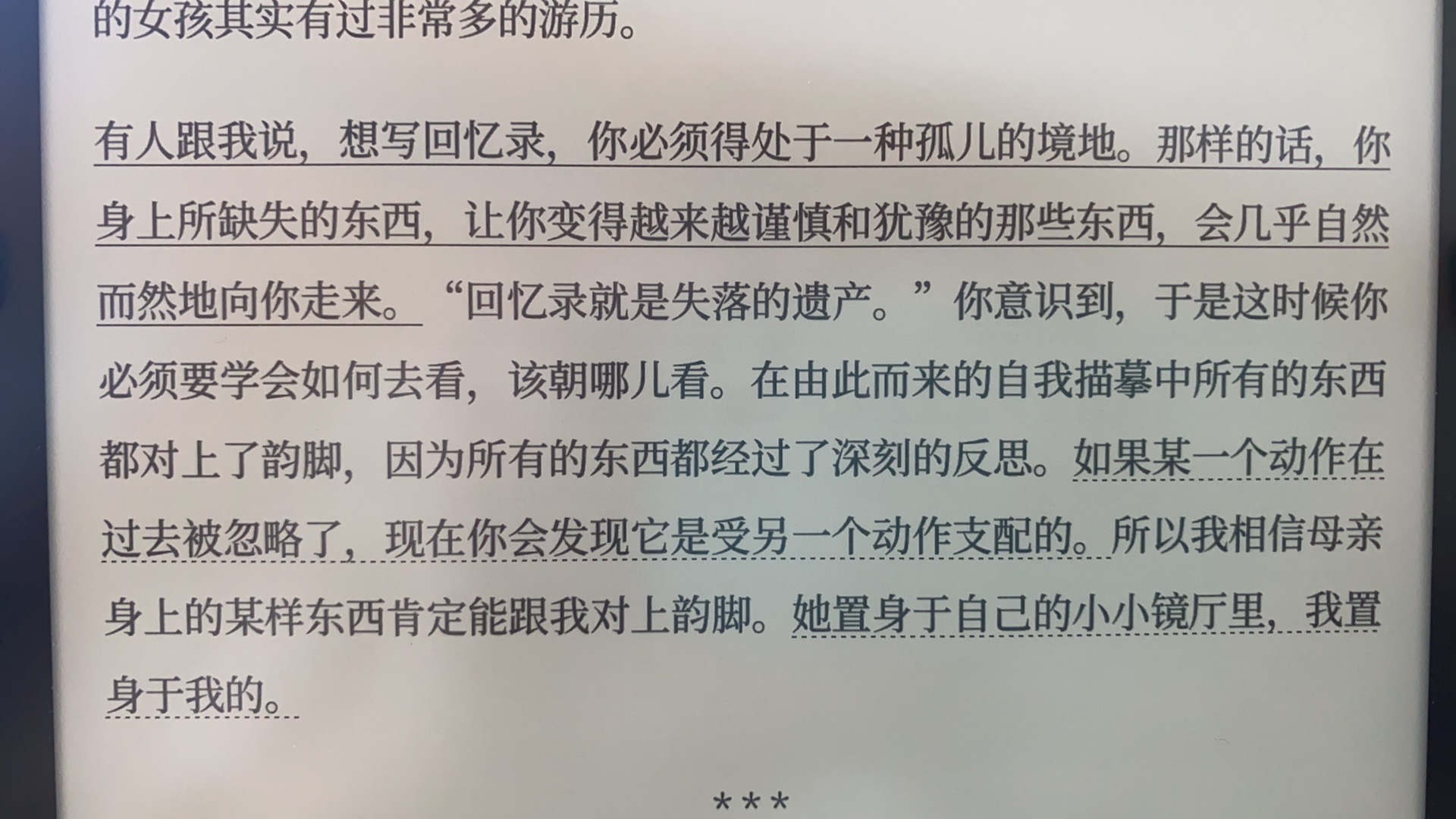 某段时期的记忆,总是真假并存。故事某些细节展开,句子沿着迷宫般的路径漫游至意义消失。因为一个人在讲述过去的时候,回到那过去的时光,他是带着现在去的,带着成年人的自我去的。这不是把往日的岁月过一遍,而是在次亲眼目睹。不管那个世界是多么黑暗,都不可能在离去的时候不带走一点光明。