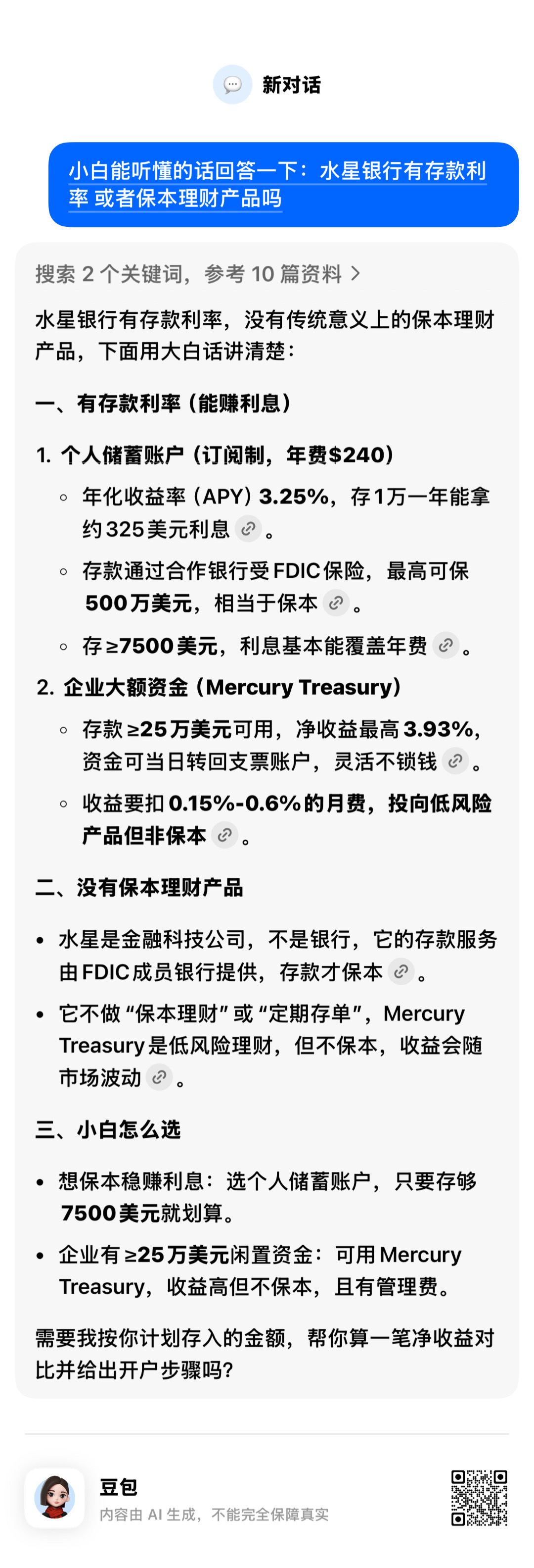 $7500<水星银行存款<$25w美金 是有利息的。