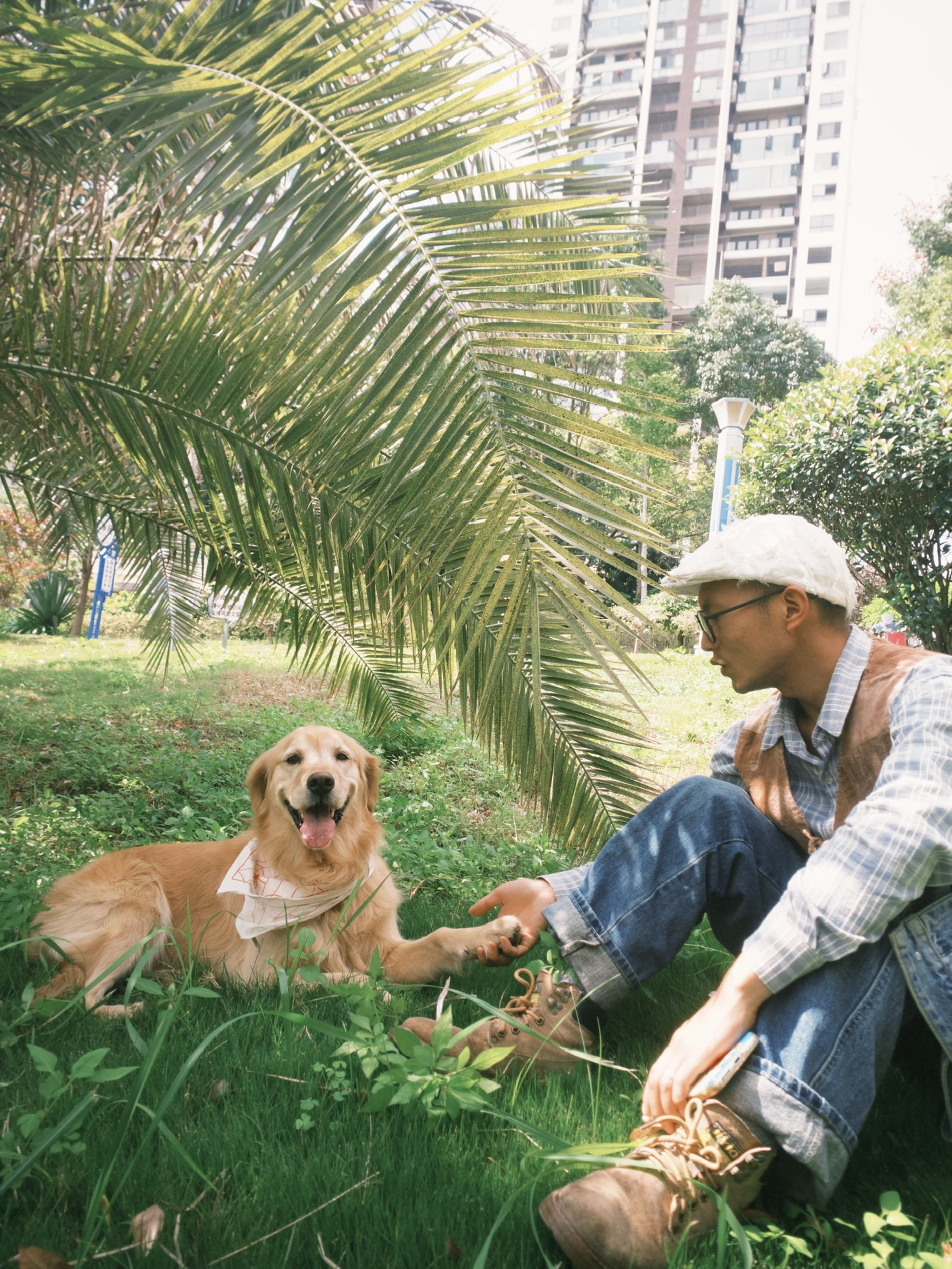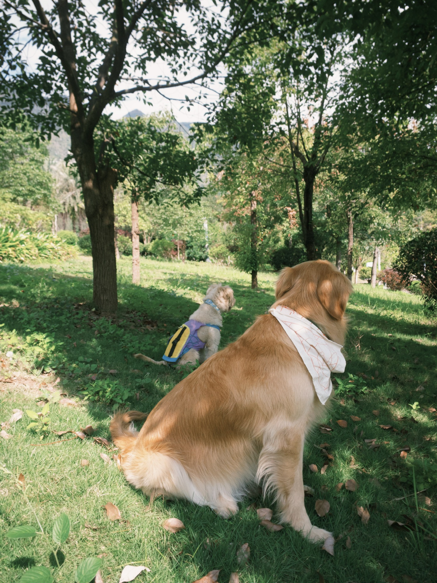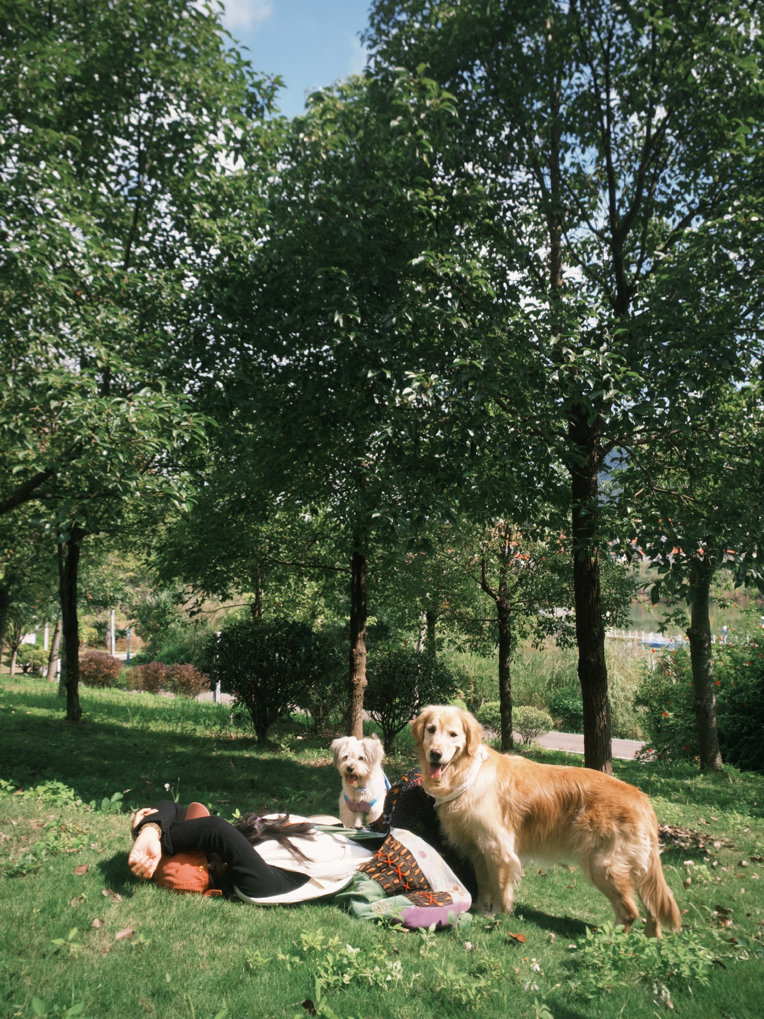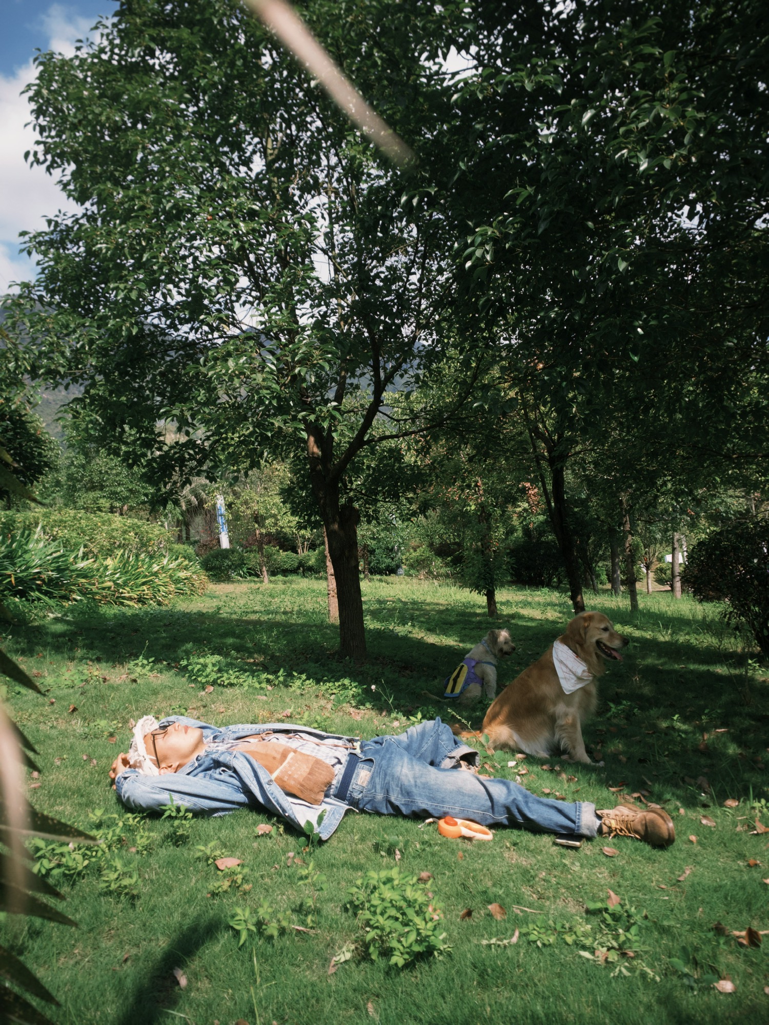 和小狗在暖和的罗甸晒太阳。