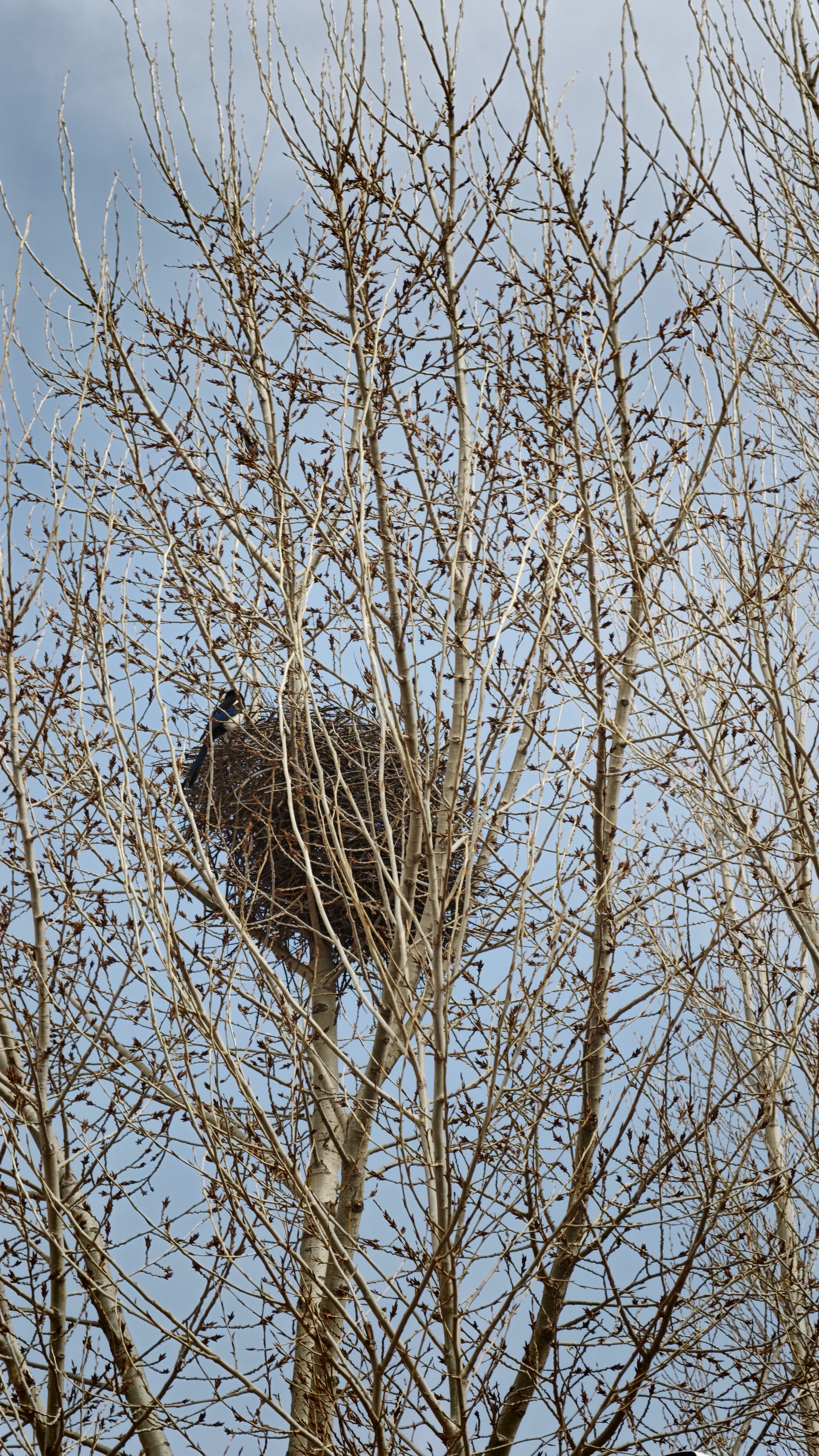 到了喜鹊搭窝的季节,看到了好几批不同的喜鹊,远观雀巢加固