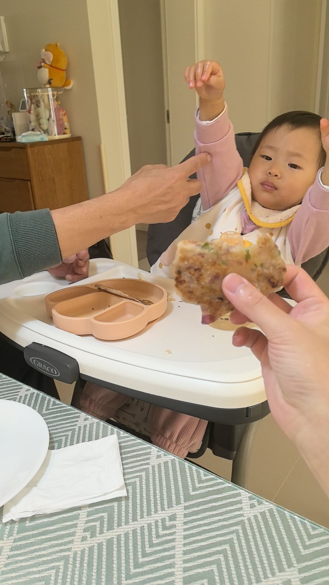 都快两岁了还是不爱吃肉令人头大,不管鸡鸭鱼虾牛羊都不吃,但极爱吃主食。米饭面条面包饼类来者不拒,只能把肉类混在饼里给她吃…