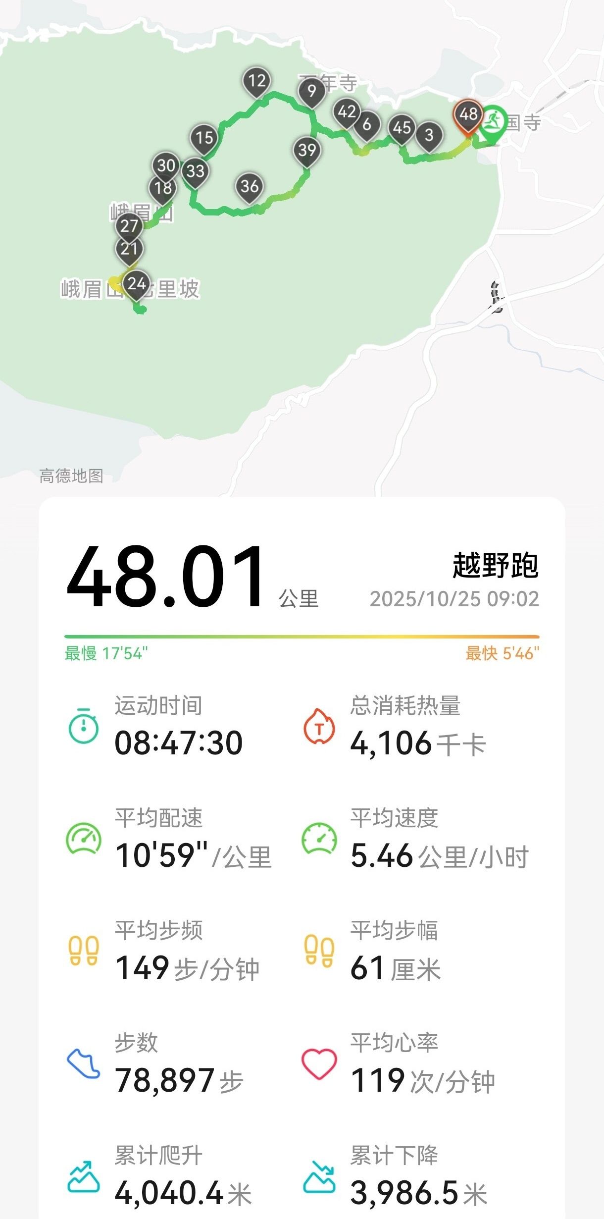 峨眉山往返 48 公里,爬升 4000+,最高海拔 3079 米, 用时 8 小时 40 多分。