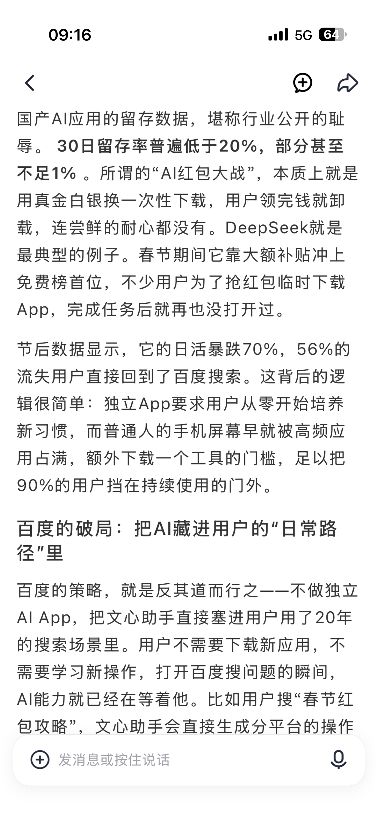 扣子每日早报的内容也太塑料了,我挨个把引用来源打开,都没看到“DeepSeek就是最典型的例子。春节期间它靠大额补贴冲上免费榜首位,不少用户为了抢红包临时下载App,完成任务后就再也没打开过。”这个信息,不知道怎么编出来的🤦♂️