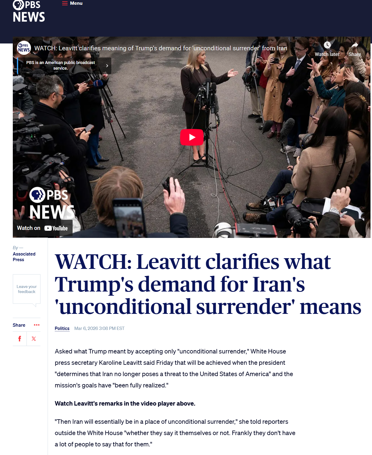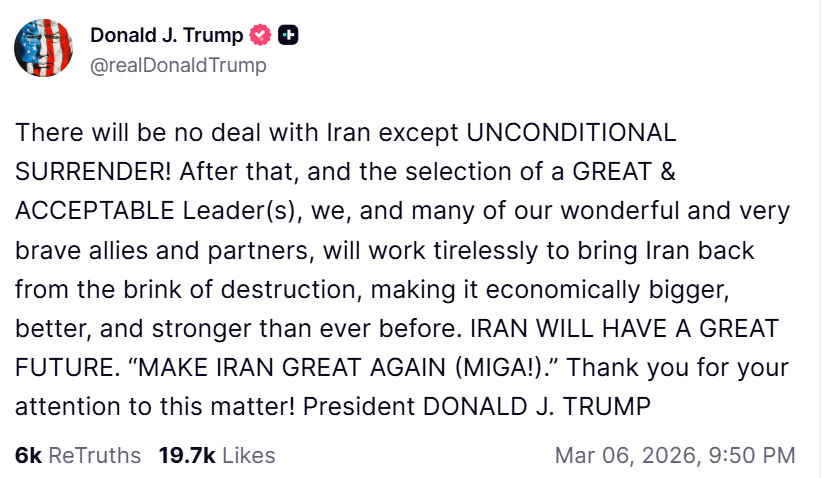 「无条件投降的意思是,当总统先生认为伊朗不再对美国构成威胁、战争的任务目标已经完全实现时,伊朗就无条件投降了。伊朗终将无条件投降,无论他们自己投降不投降,老实说他们现在也没剩多少人能替他们喊“投降”了。」 —— Karoline Leavitt
