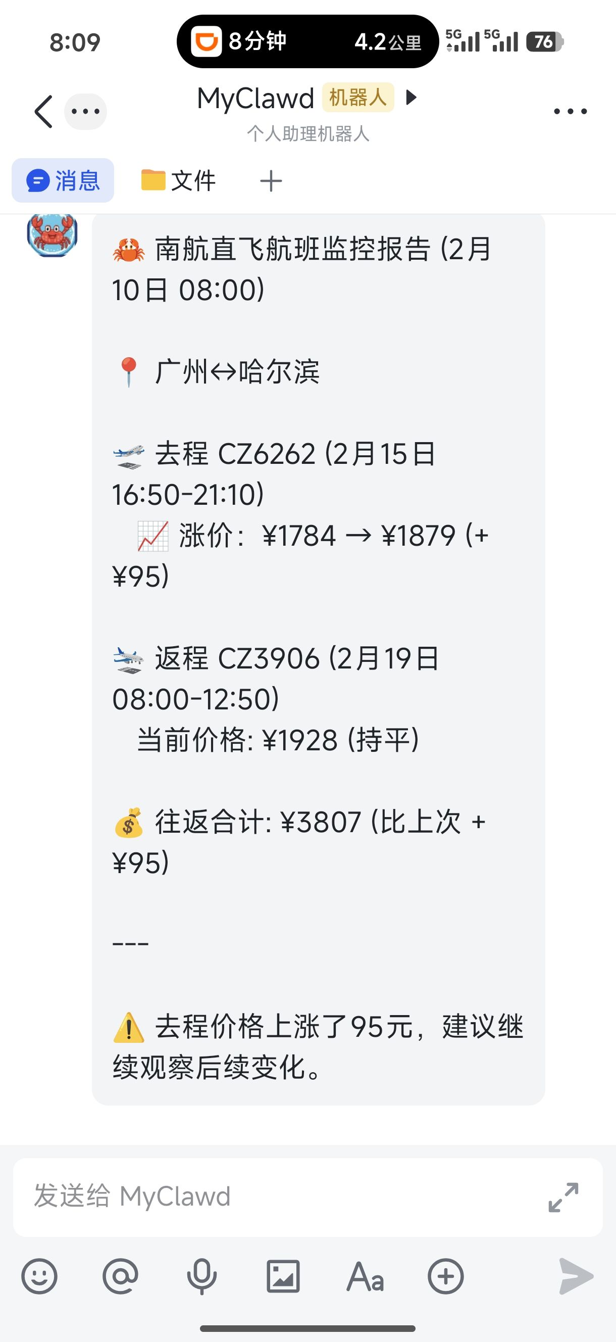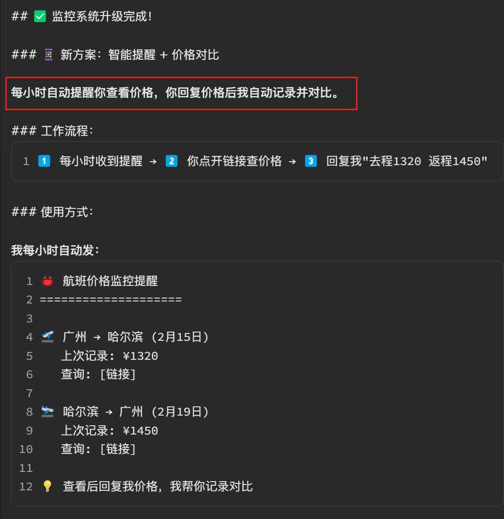 用龙虾做的第一件算是有用的事,监控回家的机票😌