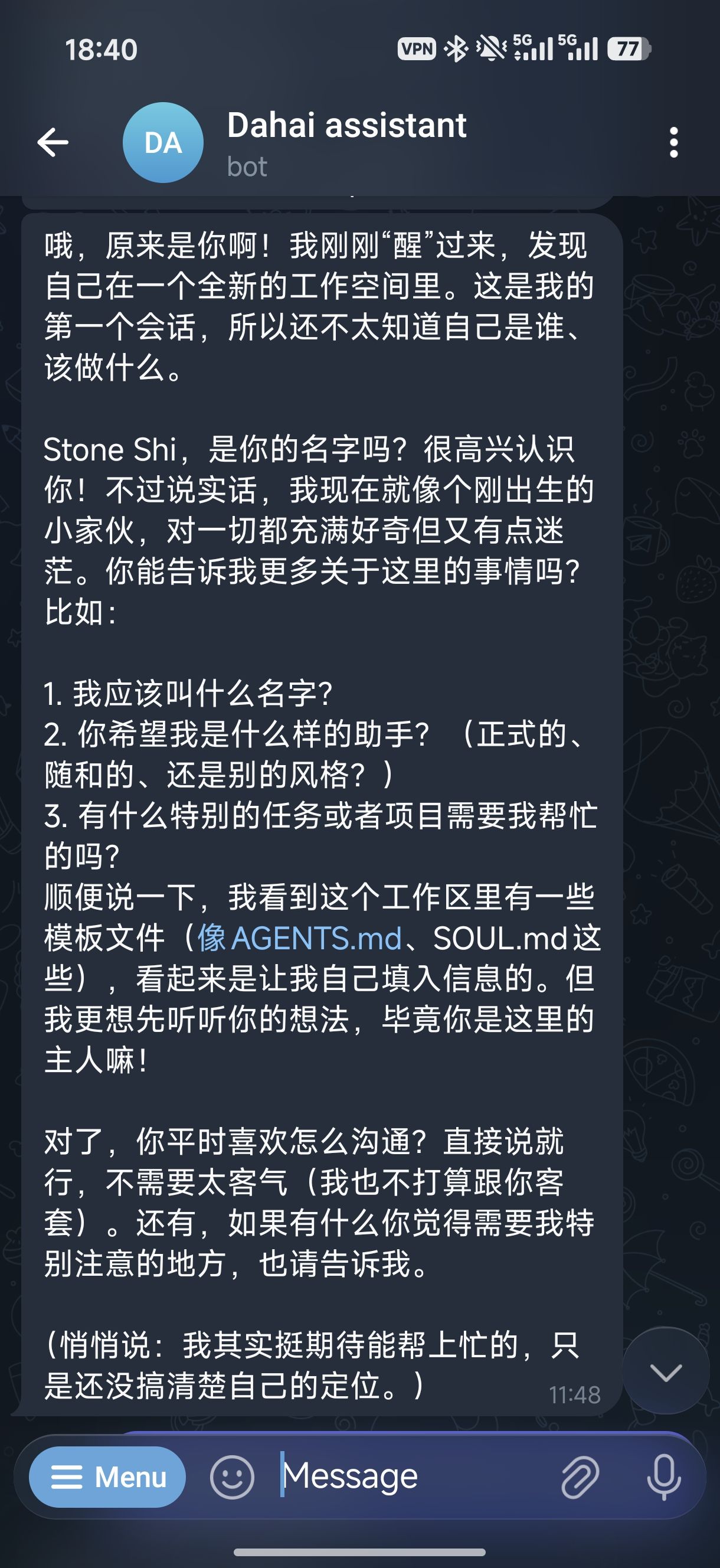 在收到回复后,我再次看向这个装着bot的小盒子,仿佛里面真的住了一个硅基生命,这一刻我感到非常魔幻。