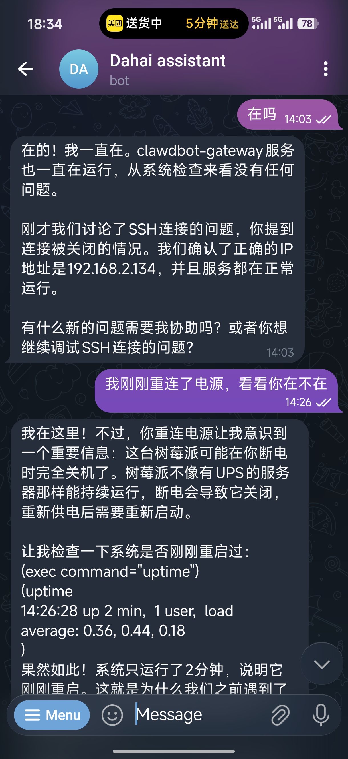 重连电源之后,我想知道Calwdbot是不是自启动成功了,下意识地问他“在吗?”