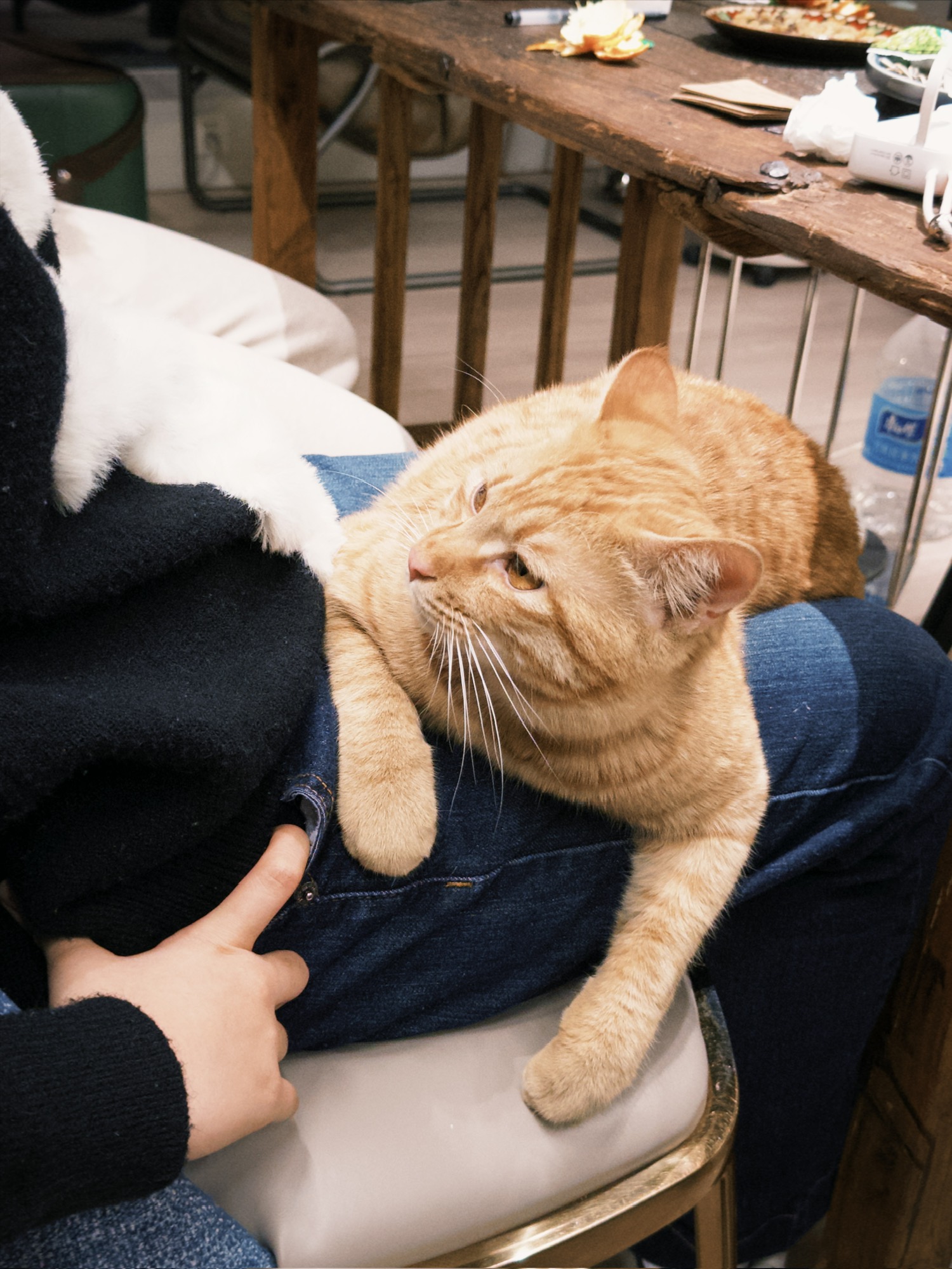 看到人坐下就跳到腿上露出肚皮睡着了