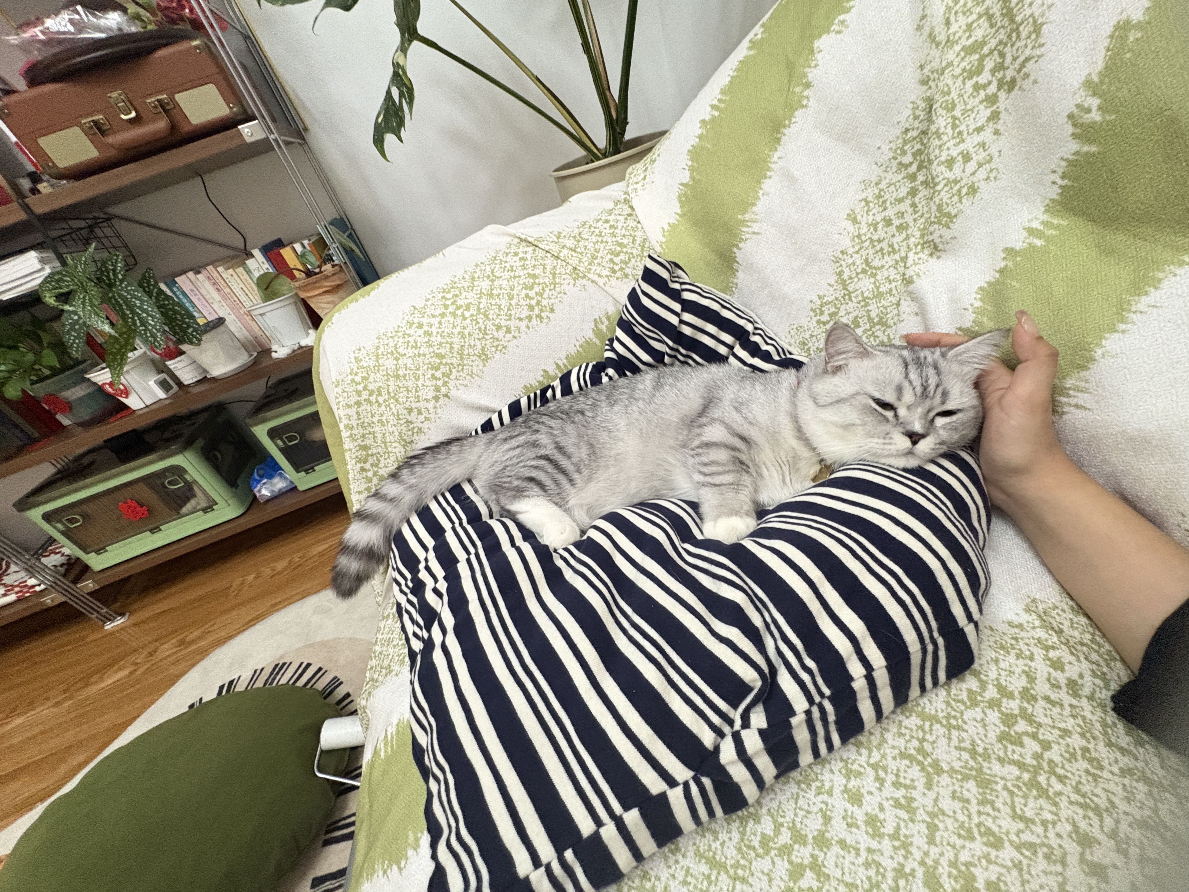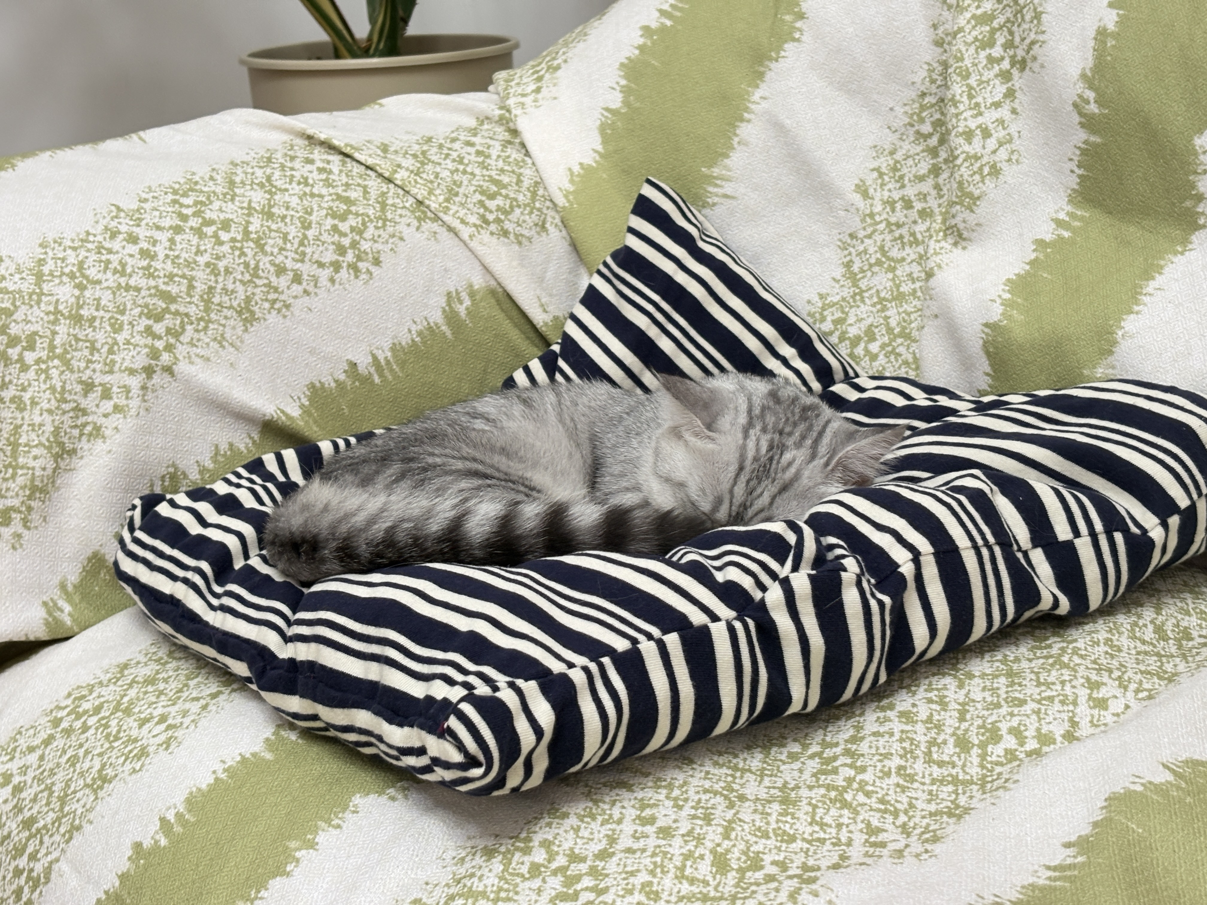 看它在我的南瓜坐垫上不够睡,牺牲了我一件短袖、之前丢枕头掏出来的棉花正好用上,缝了一个小窝窝,它已经主动睡上去了,太给面子啦