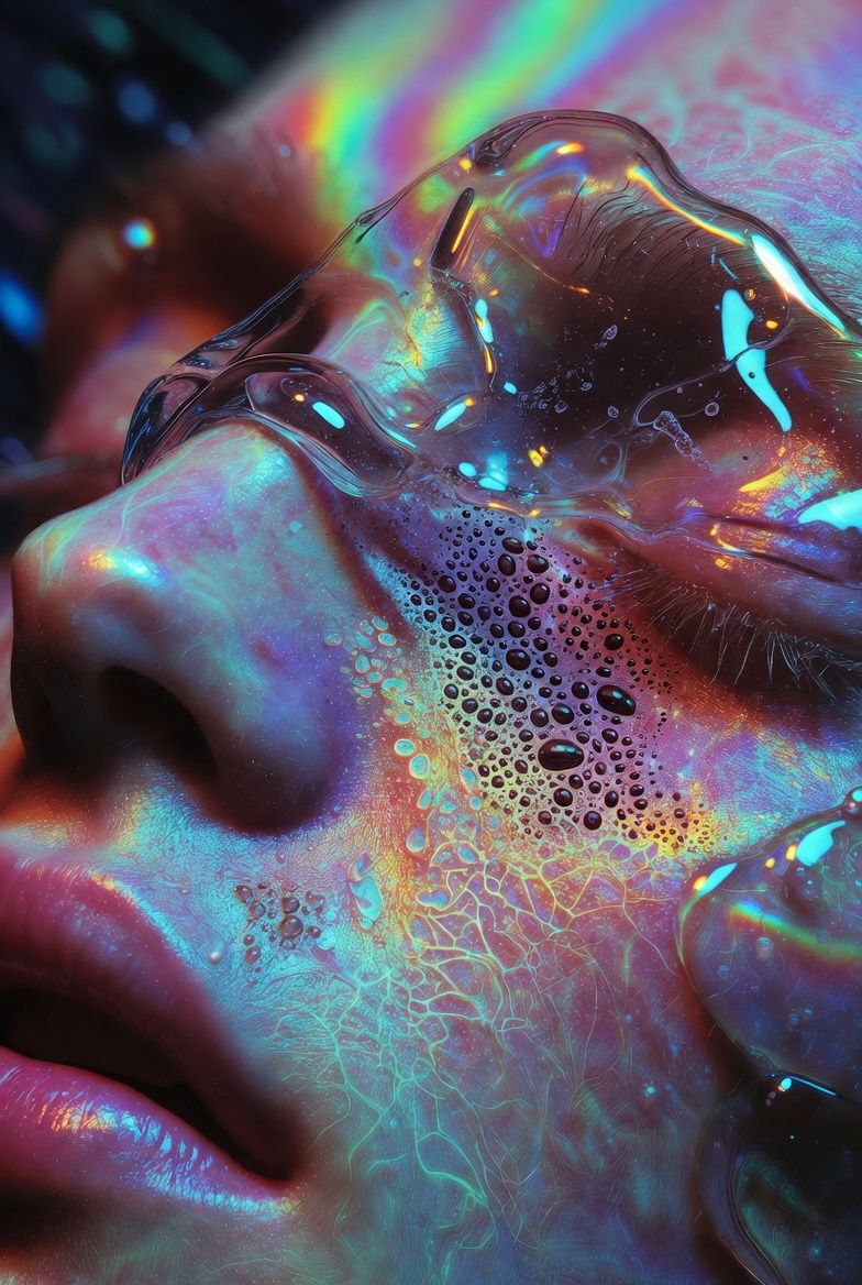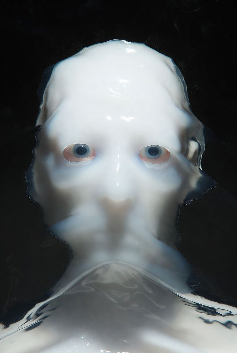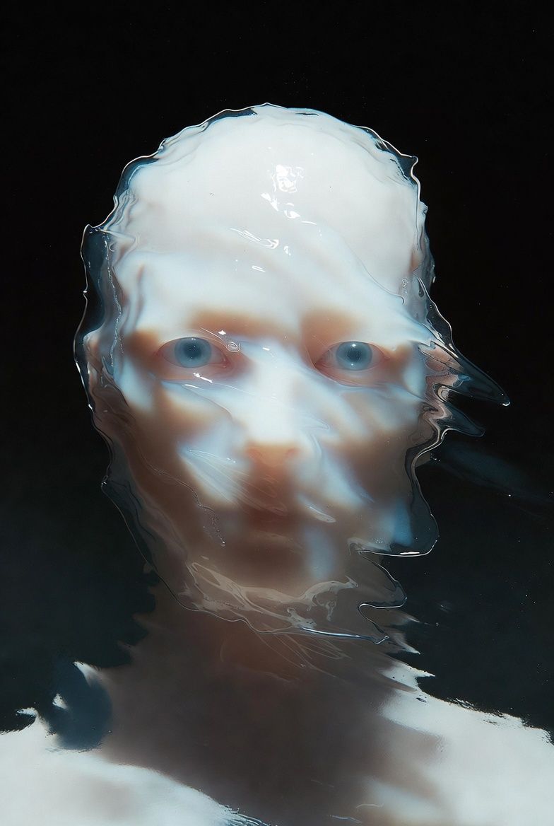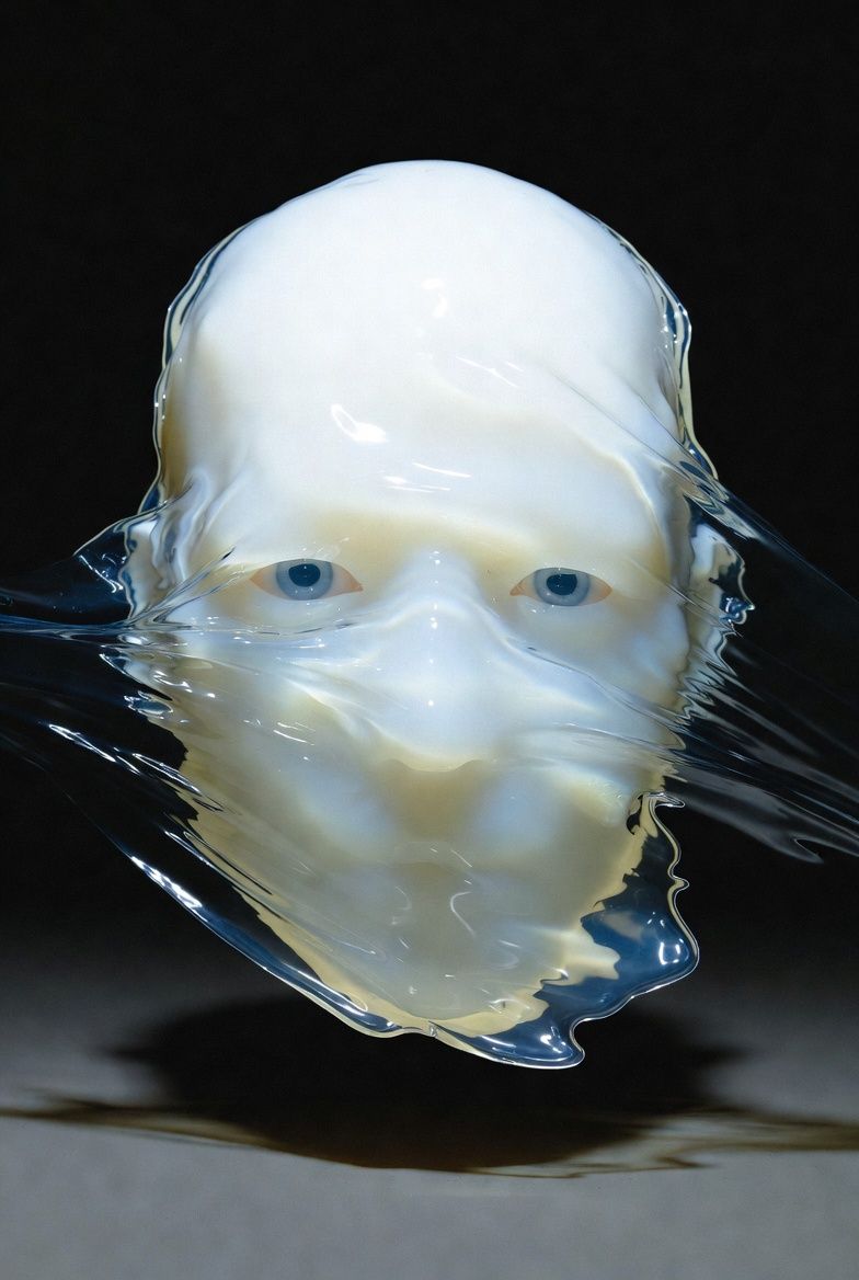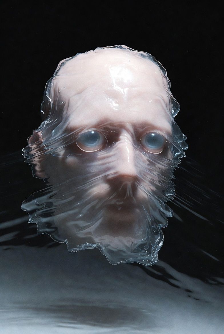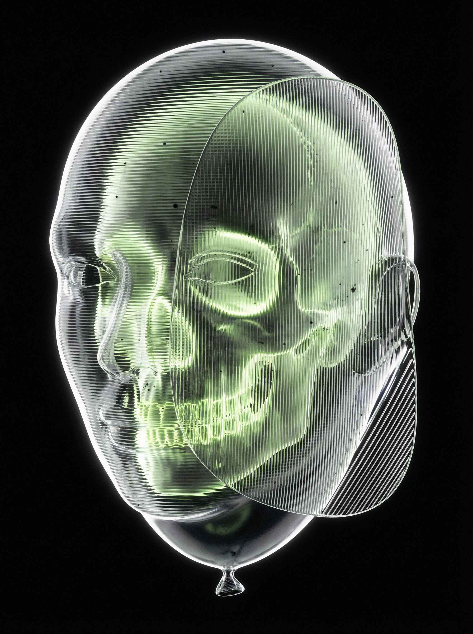 “黑色背景,一个半透明的气球雕塑人脸,被三层折射错位覆盖;每一层都有不同的扫描线方向;内部嵌入荧光骨架;表面浮动着油墨点状噪点;三处空间透视故意冲突;背景零光但边缘出现极细白边光晕。”