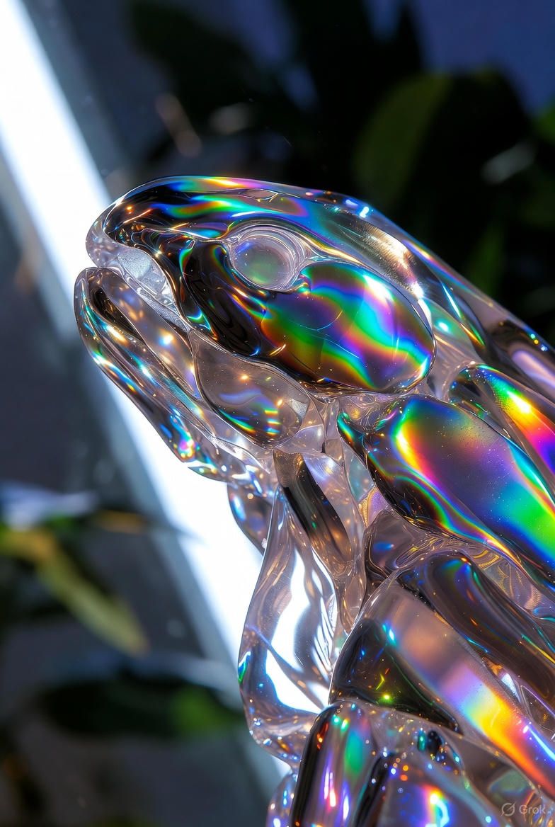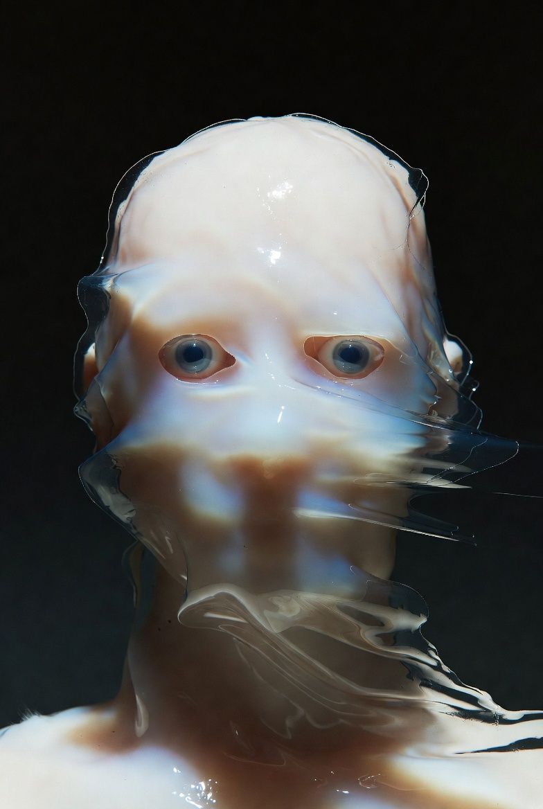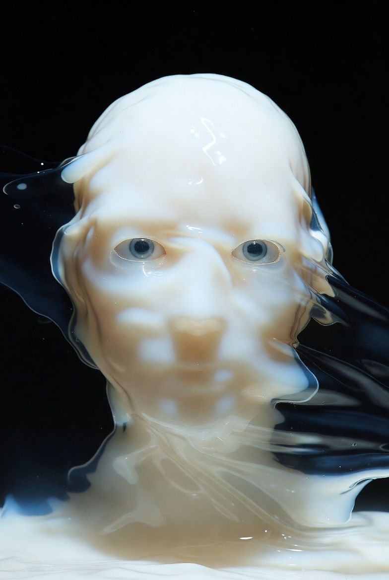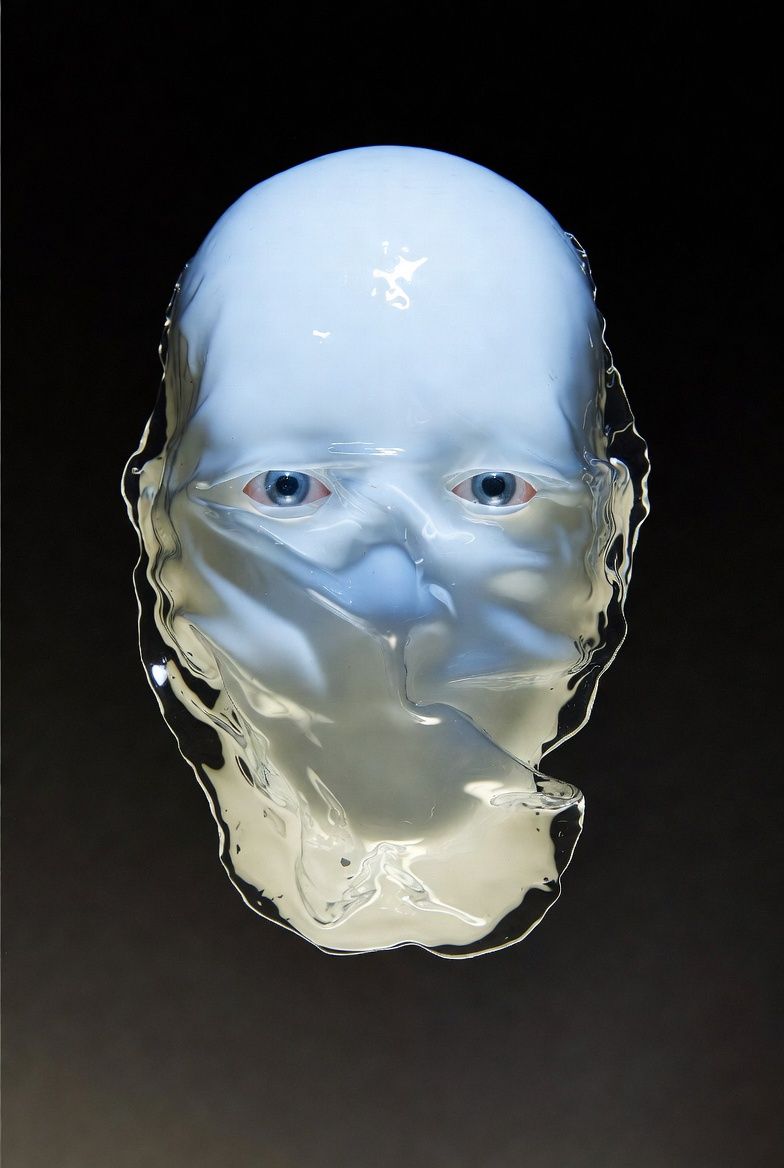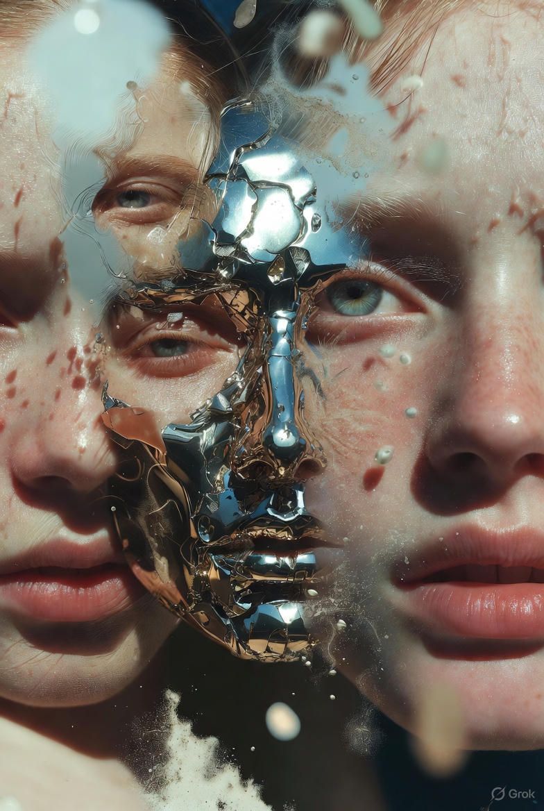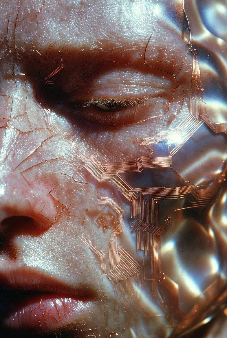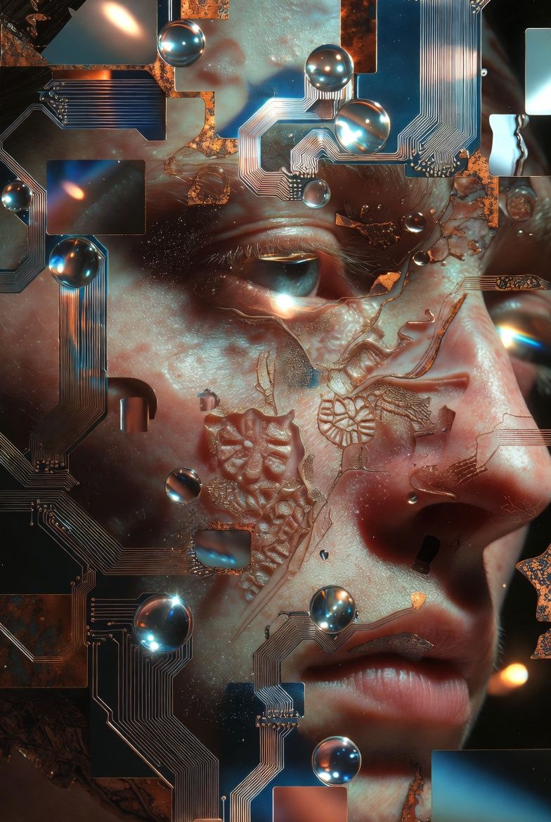 “黑色背景,一个半透明的气球雕塑人脸,被三层折射错位覆盖;每一层都有不同的扫描线方向;内部嵌入荧光骨架;表面浮动着油墨点状噪点;三处空间透视故意冲突;背景零光但边缘出现极细白边光晕。”
