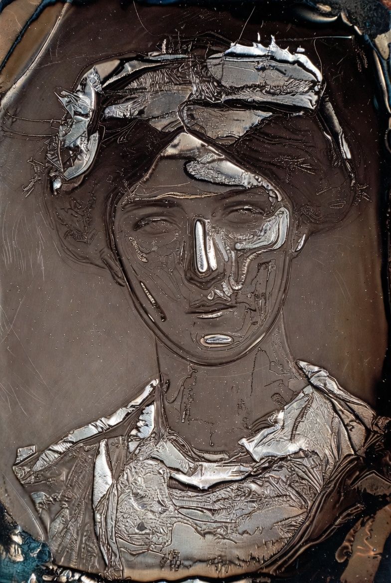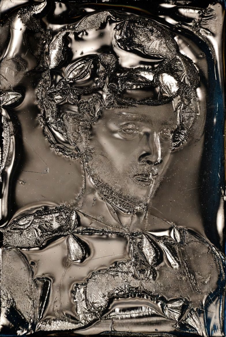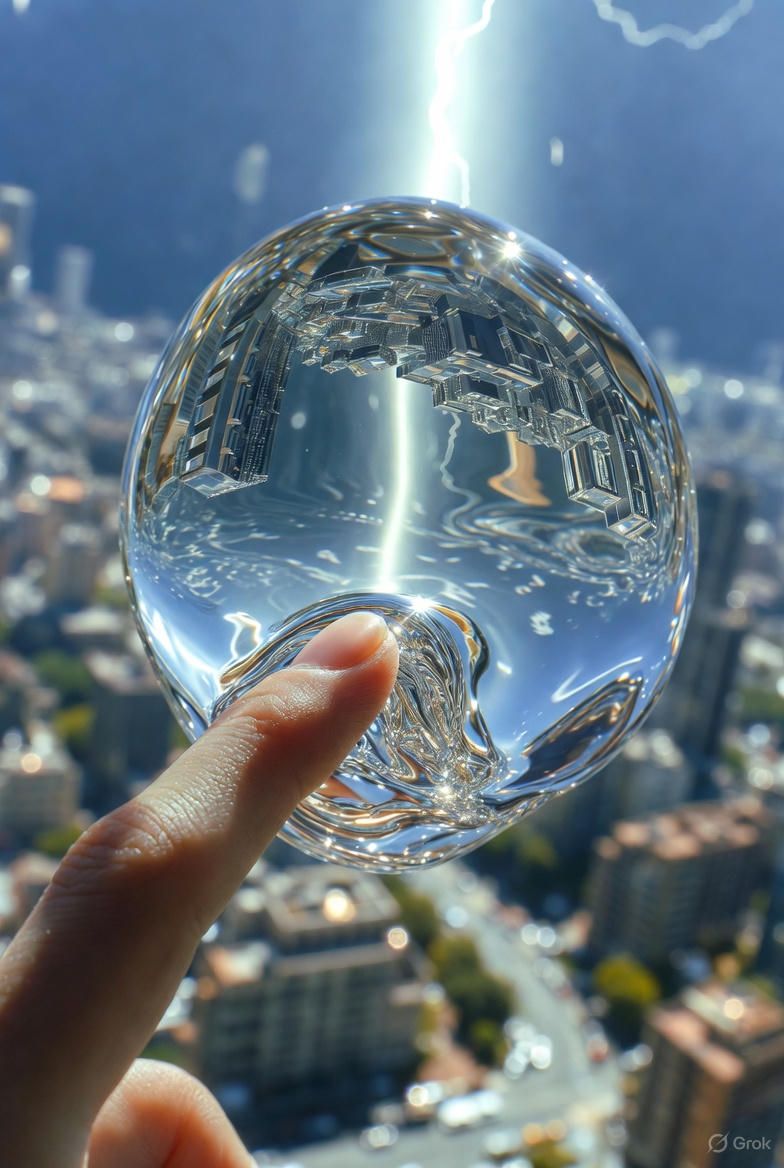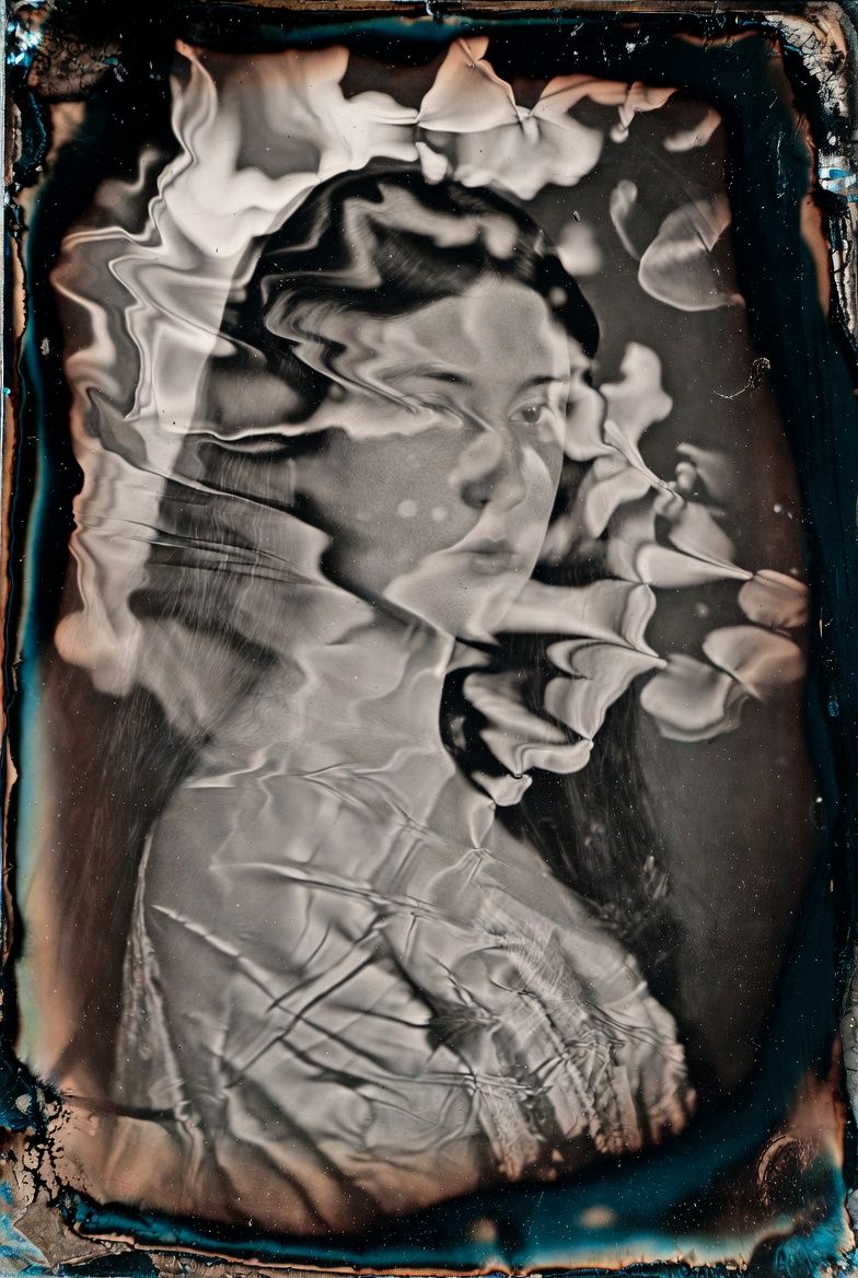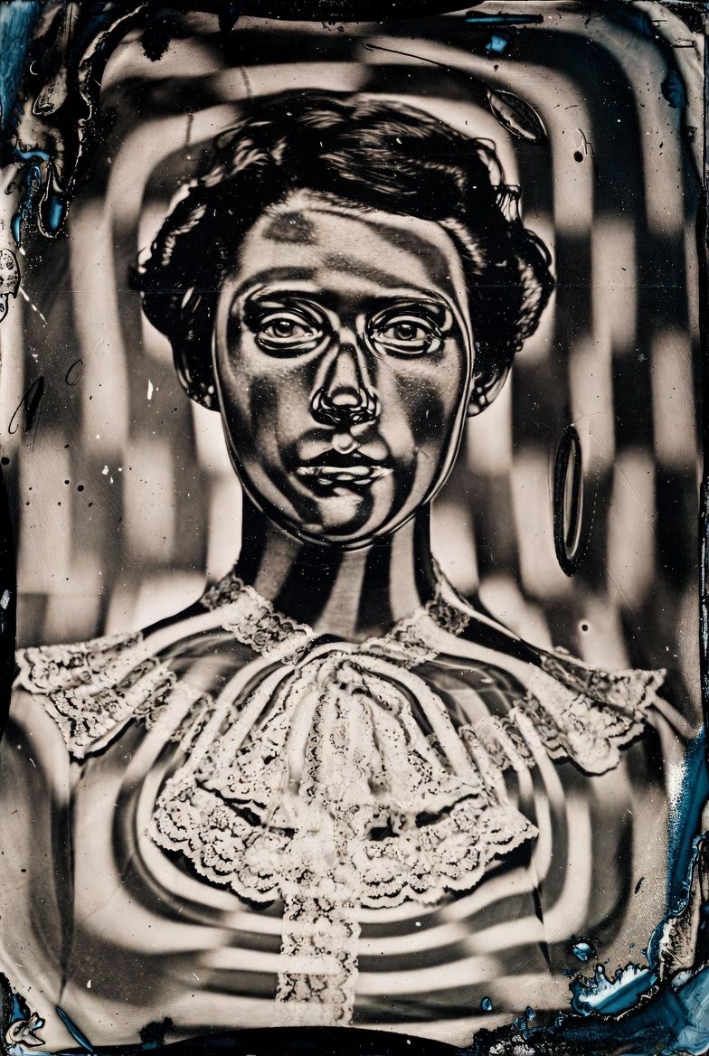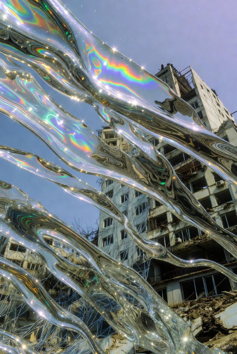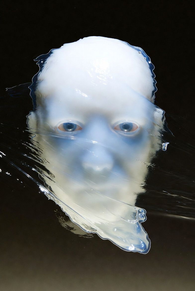“黑色背景,一个半透明的气球雕塑人脸,被三层折射错位覆盖;每一层都有不同的扫描线方向;内部嵌入荧光骨架;表面浮动着油墨点状噪点;三处空间透视故意冲突;背景零光但边缘出现极细白边光晕。”