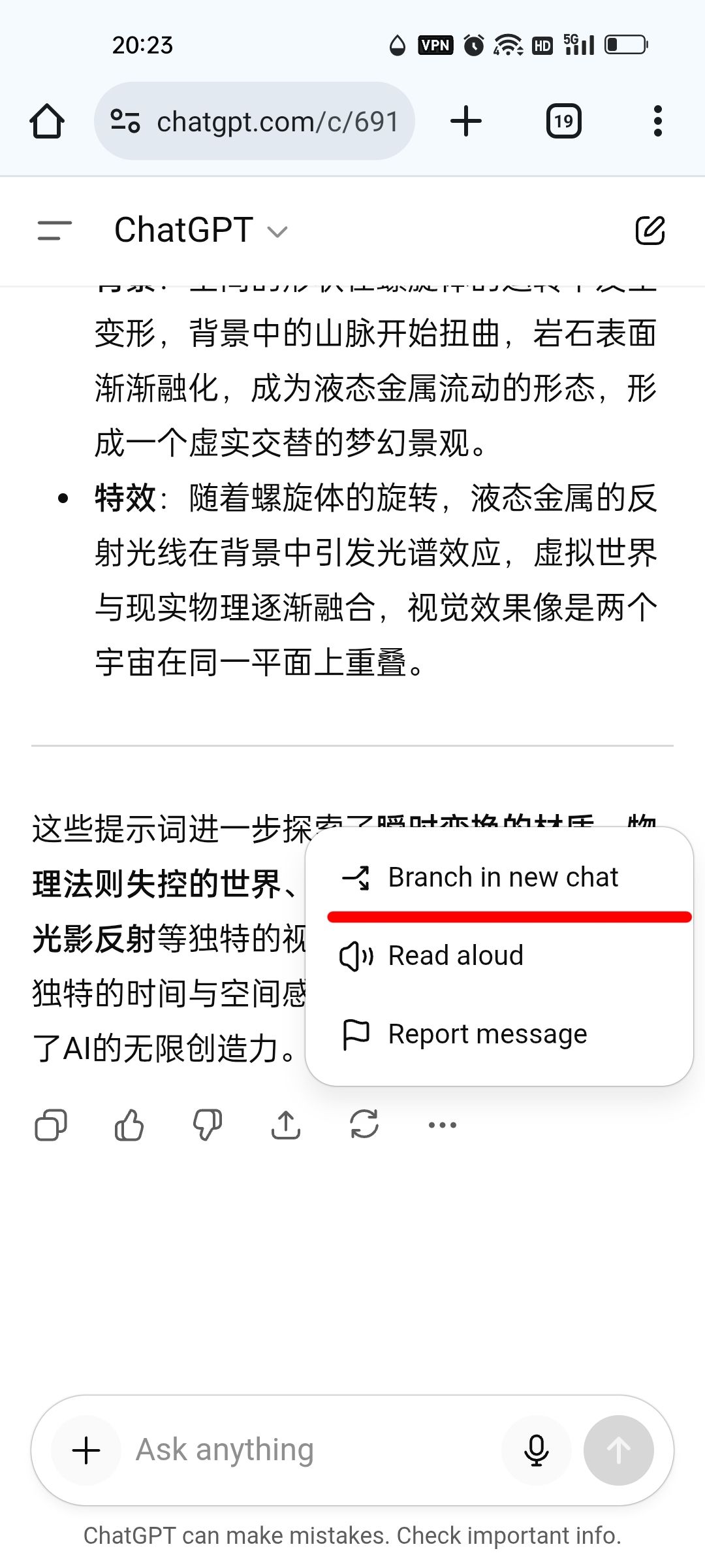 刚刚发现chatgpt总结当前聊天分叉到新的聊天页面:branch in new chat 功能可以用了。