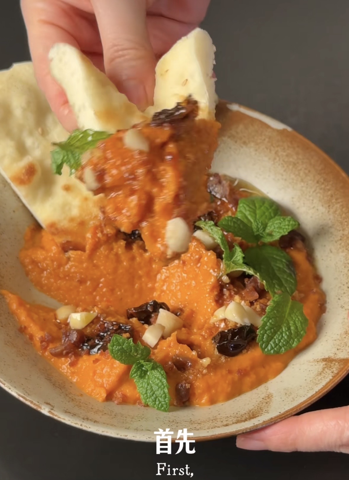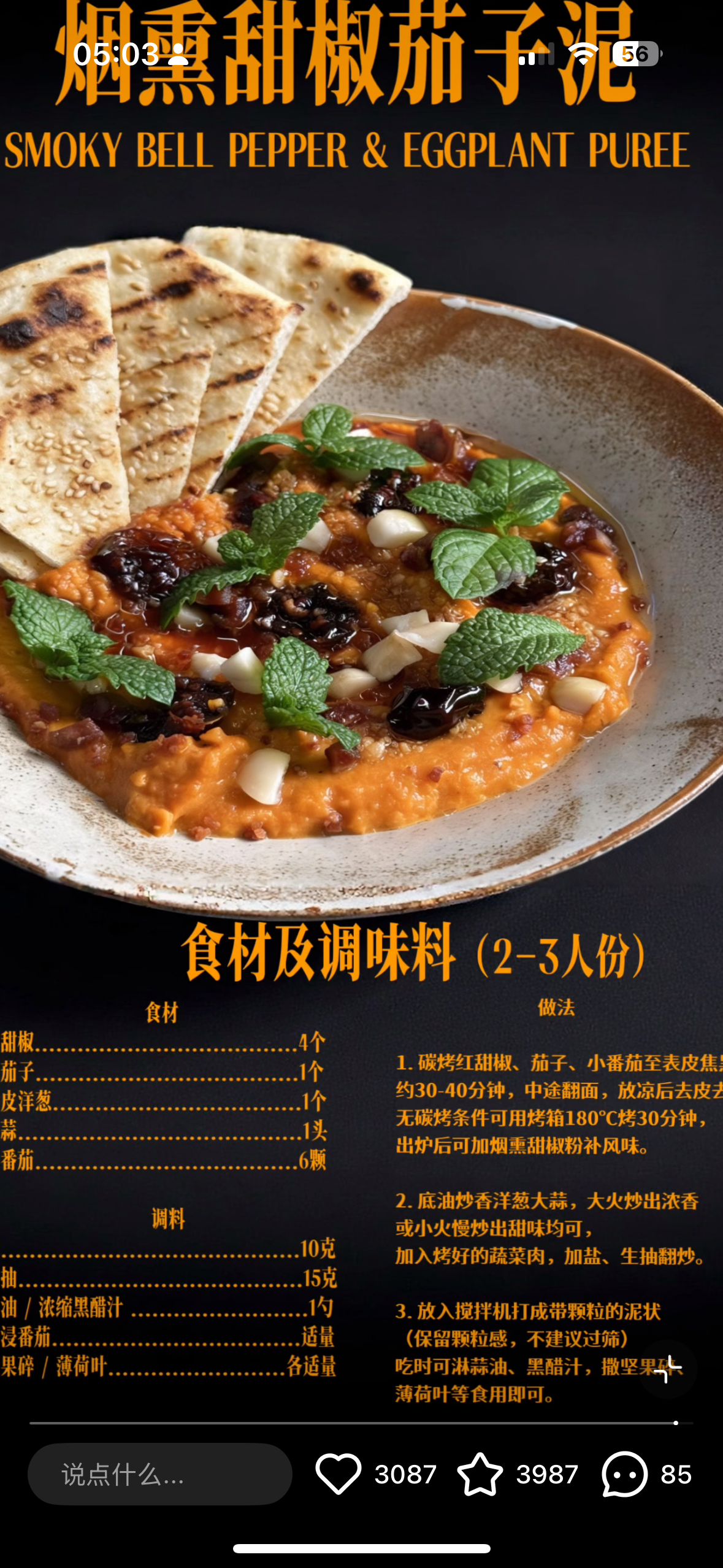 做brunch或bistro的话也可以单出,挖一大勺烟熏甜椒茄子泥,淋上一圈蒜油,少量浓缩黑醋汁增香解腻(我这里用的黑醋不太行),放几粒油浸番茄增加层次,再撒上坚果碎香脆极了,点缀几片薄荷叶搭配刚烤好的香喷喷的馕饼,简直不要太满足!