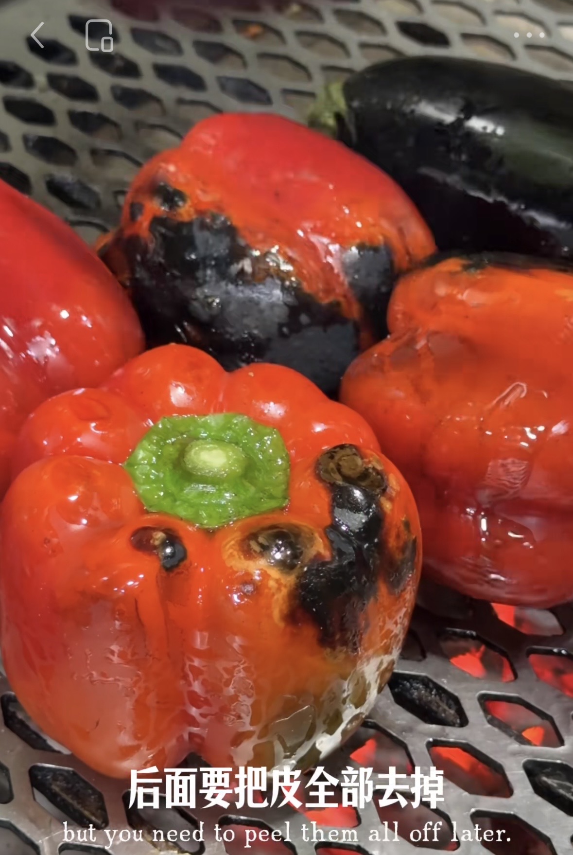 想要最棒的烟熏风味一定要选择碳烤的方式,烟熏风味自然而浓郁,蔬菜表面要烧匀,烧黑一点也没关系,后面要把皮全部去掉,缺点是时间比较长,大概需要30-40分钟,中途还要时不时去翻面。
