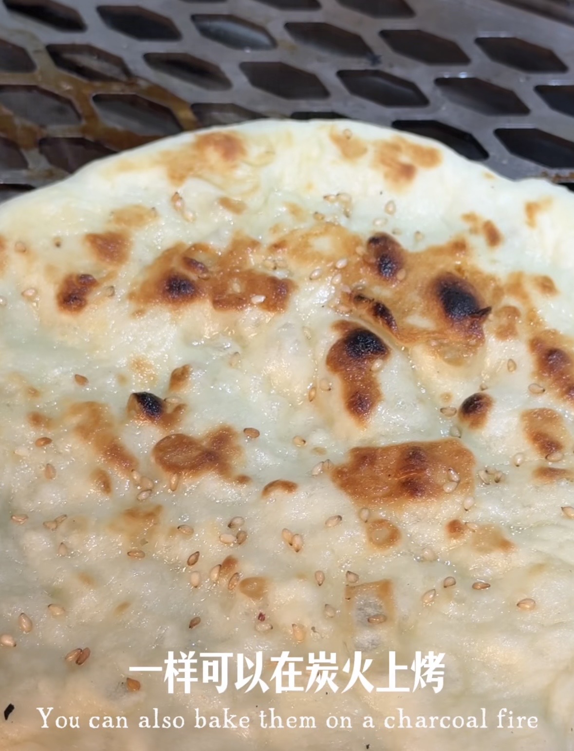 按比例加入食材,揉成团后醒发十分钟,揉面排气,把它分成四份,再醒发十分钟,就可以手动摊饼了,面饼刷油放芝麻,一样可以在炭火上烤或是烤箱里烤。