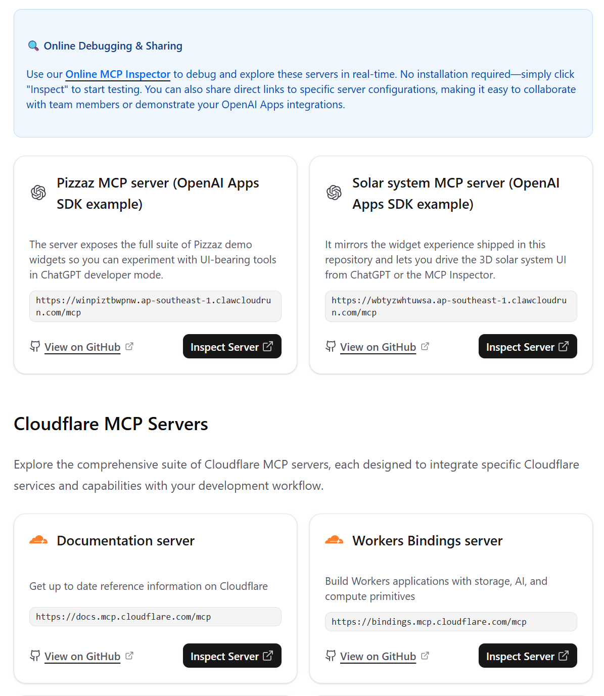 这个网站列出了一些 MCP 服务,最牛逼的是可以直接打开在线的 MCP Inspector 去调试探索 MCP 服务,全程不需要安装或者运行任何命令,还可以直接分享。对 MCP 有兴趣或者想要学习的可以收藏一下: