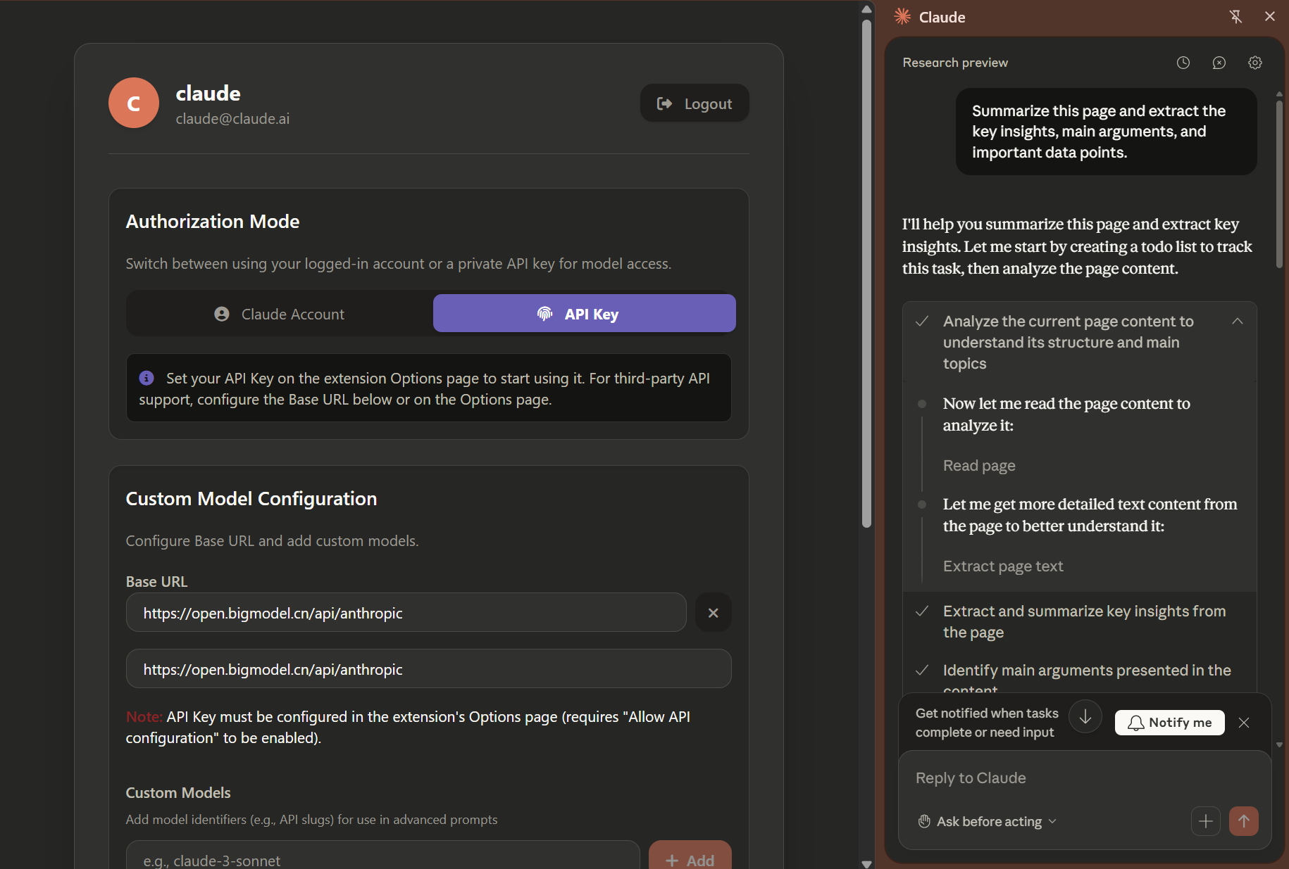 最新版 Claude for chrome 1.0.31 破解版,没有Claude 账户也能用,支持 API key,支持兼容 Claude 的API (Deepseek,qwen 等都支持)