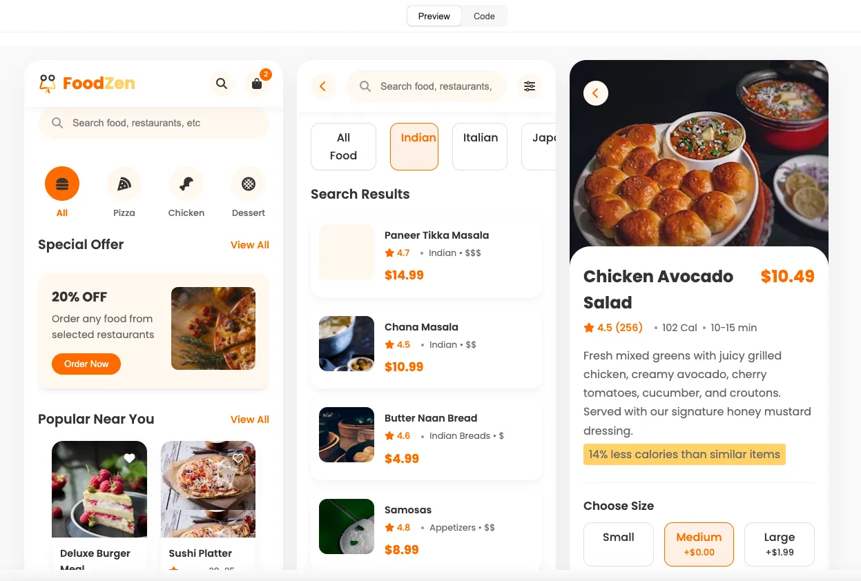"Create a vibrant food delivery app with 3 pages: Home, Search and Product Detail, using a white base with orange and yellow accents."