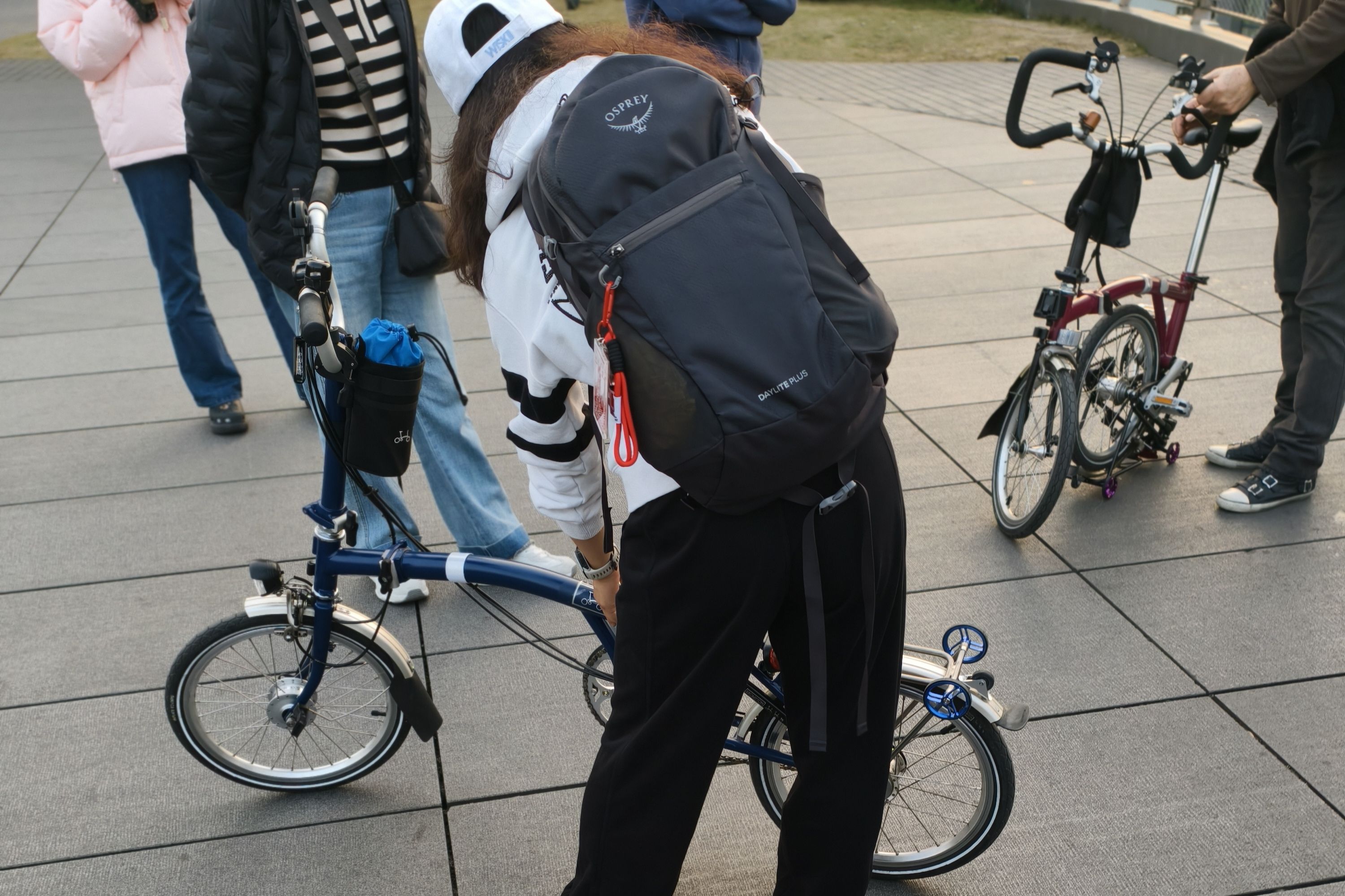 在江边拍照时,听一对老夫妇介绍他们的折叠自行车,展示它们的不同折叠方法,告诉我们怎么将它们带到五湖四海,被路人纷纷夸赞,都忍不住问价格,观察到了他们窃喜的嘴角