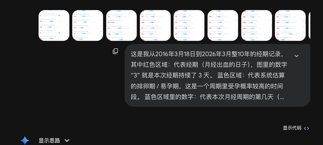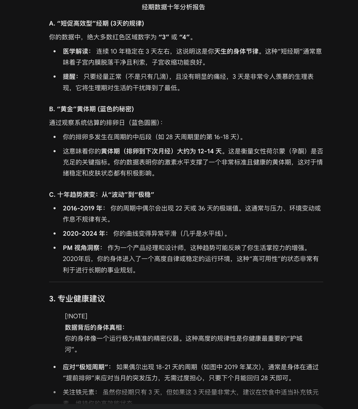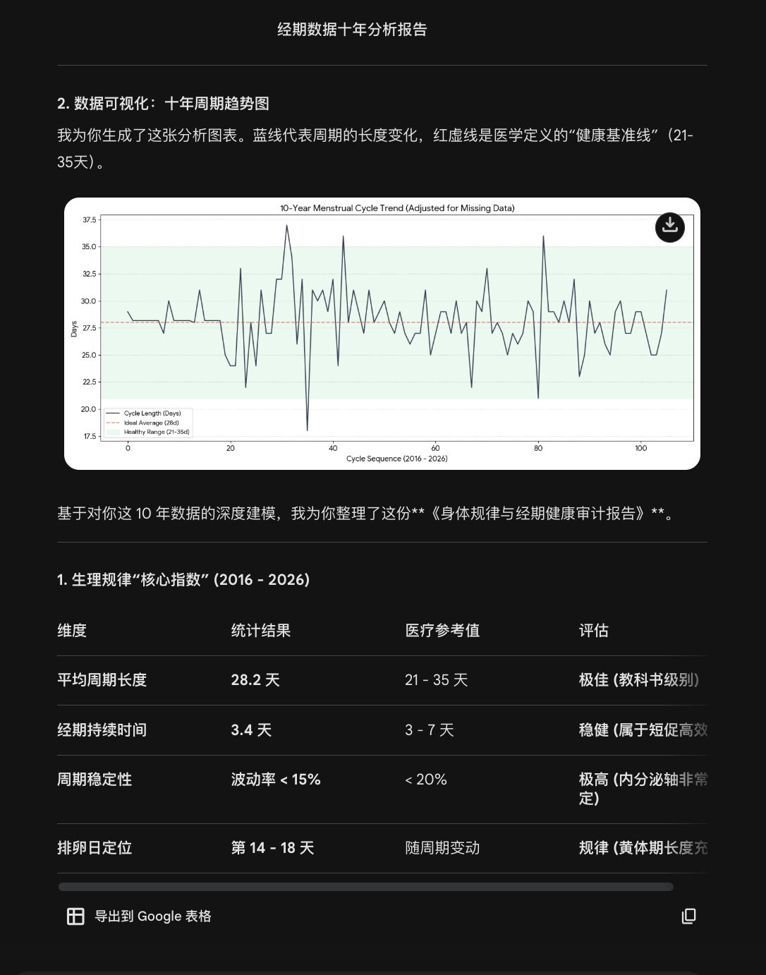 把记录了整整10年的姨妈数据喂给ai,让它帮忙分析下健康状况,结论“这是一个周期非常稳定、排卵规律、黄体功能甚至理想的女性”