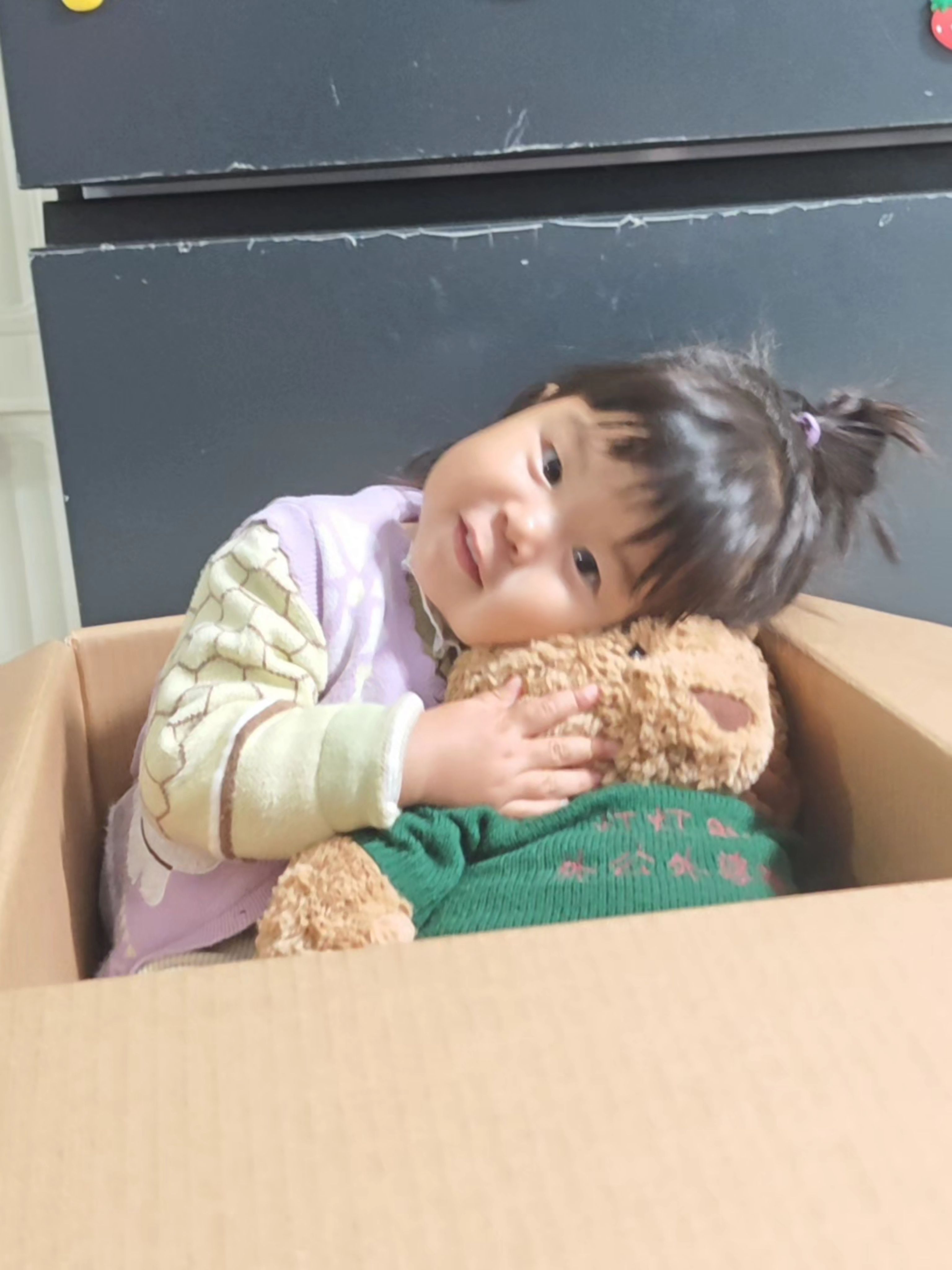 呼吸均匀之前又爬起来了,还是离不开我的抱抱,趴我身上直接睡着