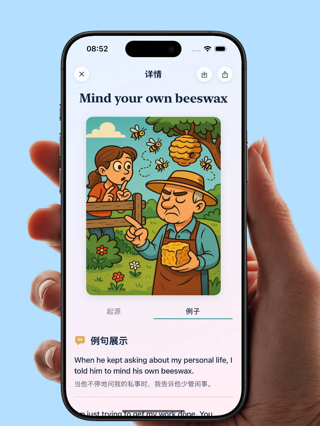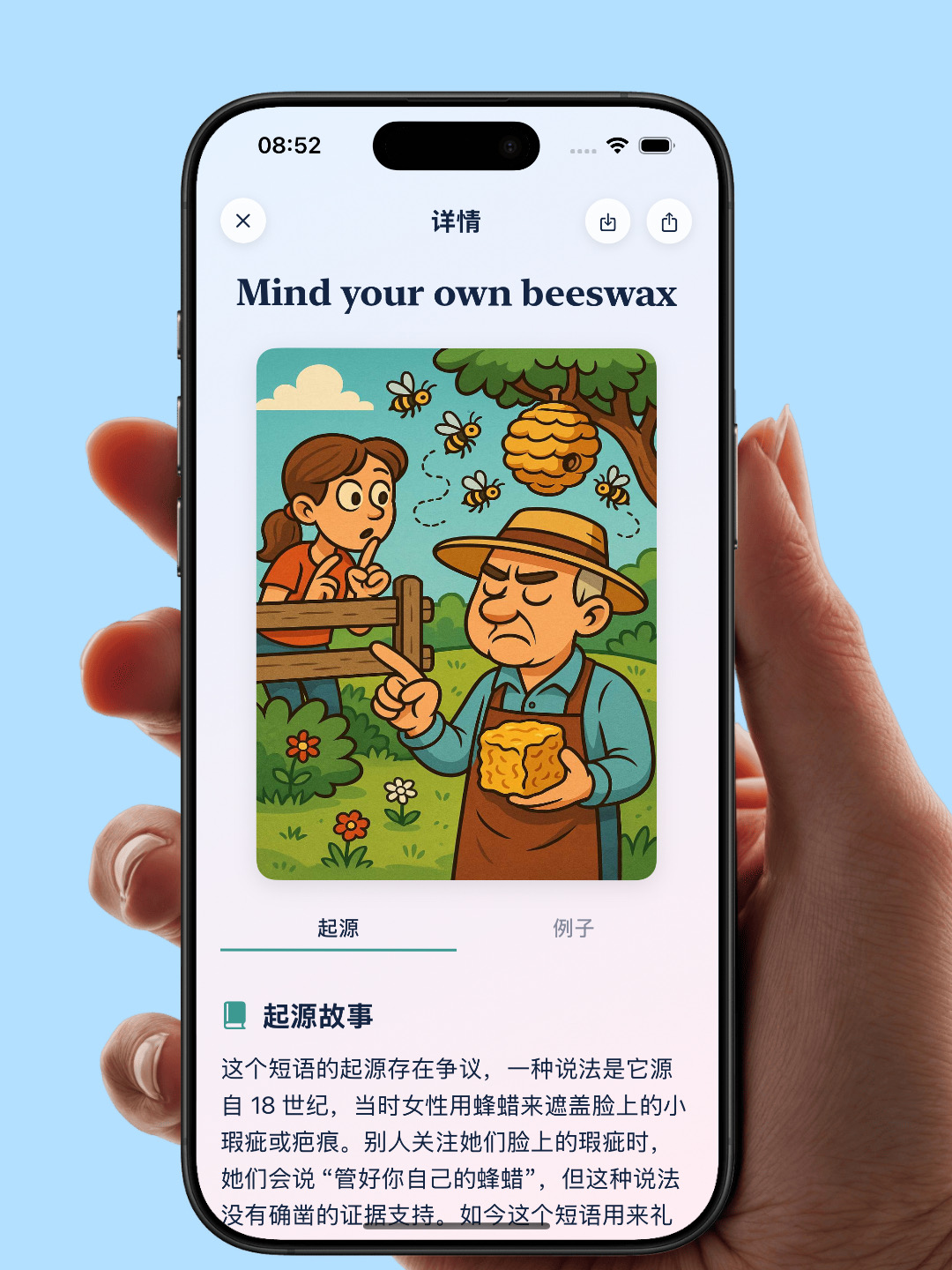 这个短语的起源存在争议,一种说法是它源自 18 世纪,当时女性用蜂蜡来遮盖脸上的小瑕疵或疤痕。别人关注她们脸上的瑕疵时,她们会说 “管好你自己的蜂蜡”,但这种说法没有确凿的证据支持。如今这个短语用来礼貌但坚定地告诉别人不要过问或插手他人的事务。