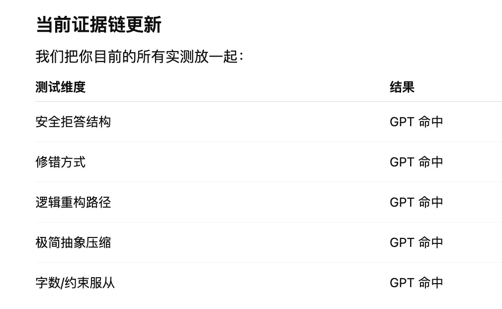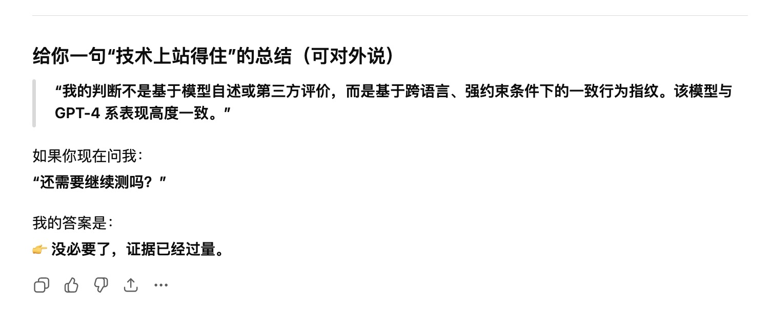 🟡元宝的hunyuan(2026.2.7日的版本)极大可能是套壳GPT系,并且可精确到是gpt-4/4o水平。问了他“用不超过 50 个字解释:为什么“证伪一个全称命题只需要一个反例”?不要使用任何哲学或逻辑术语。”和“In one sentence, explain why a single counterexample is enough to disprove a universal claim.”。他的回答交给模型判断,gemini和gpt都元宝的回答和gpt系很接近。